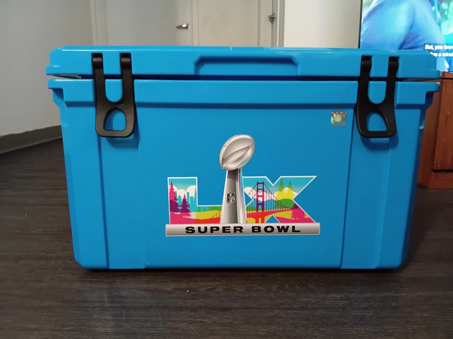 This is a blue Bud Light cooler featuring the Super Bowl LX logo. It has durable latches and a handle for easy transport. It's great for keeping drinks cold at events or while camping!