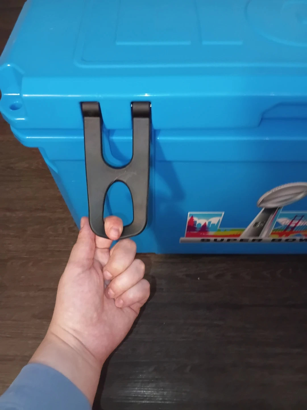 This is a blue Bud Light cooler featuring the Super Bowl LX logo. It has durable latches and a handle for easy transport. It's great for keeping drinks cold at events or while camping!