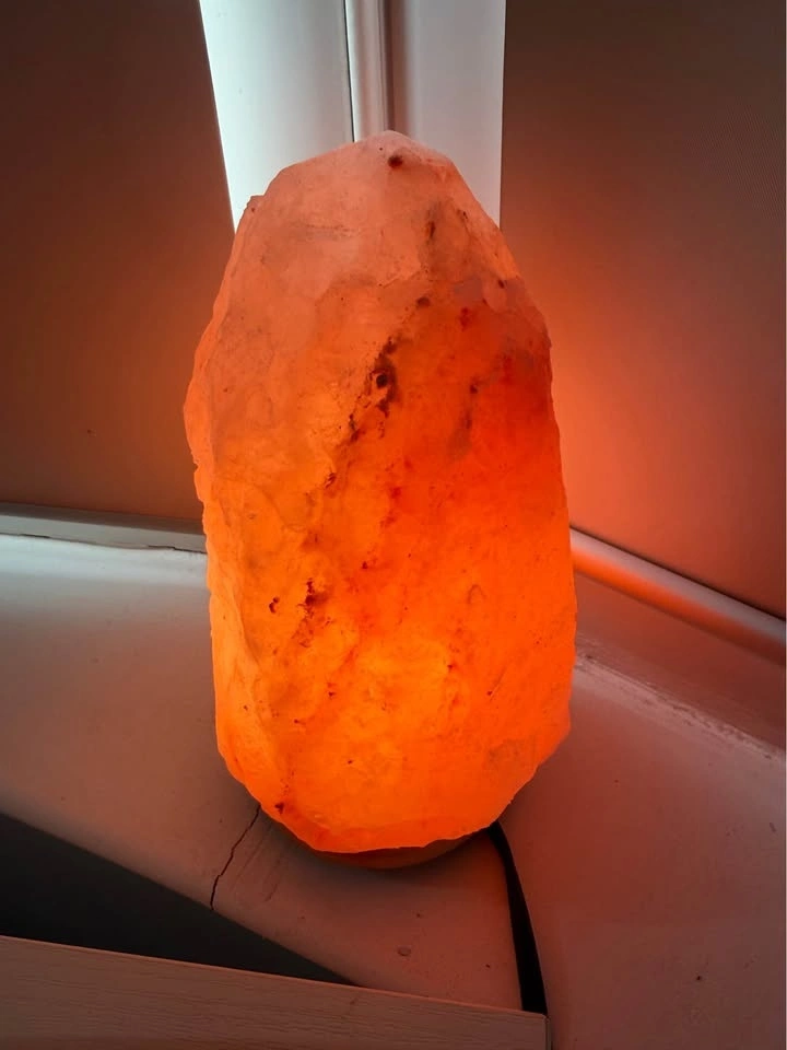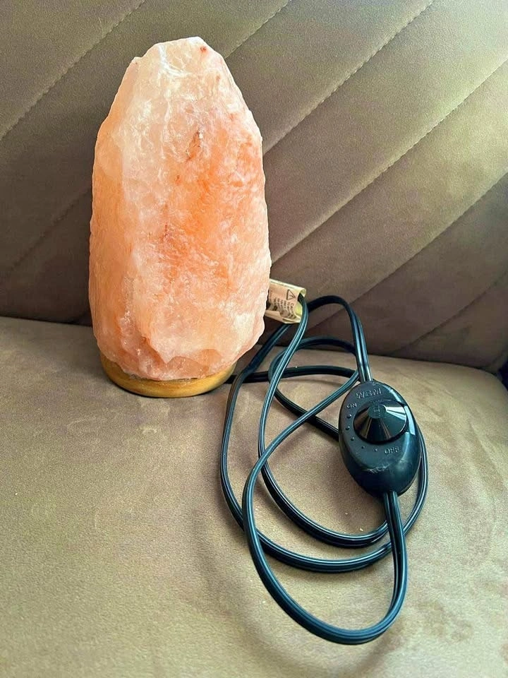 Selling a Himalayan pink salt lamp with a wooden base and dimmer switch.