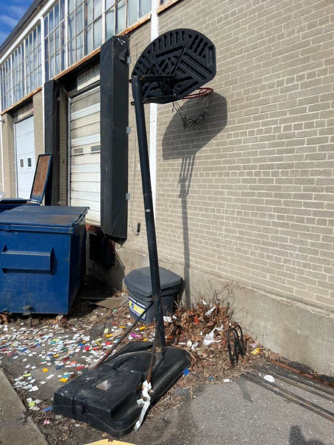 This is a portable basketball hoop. It's made of durable plastic and metal. The hoop is adjustable in height. Great for backyard play!