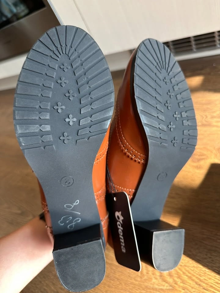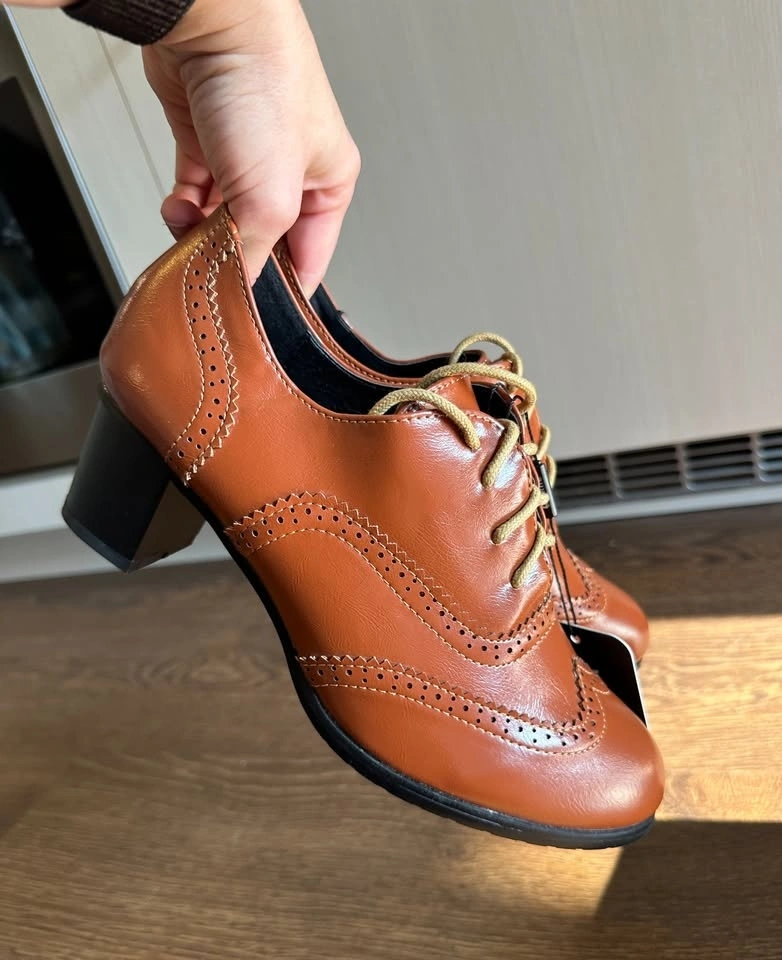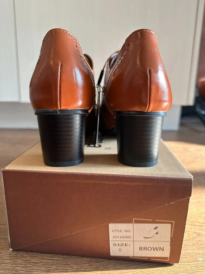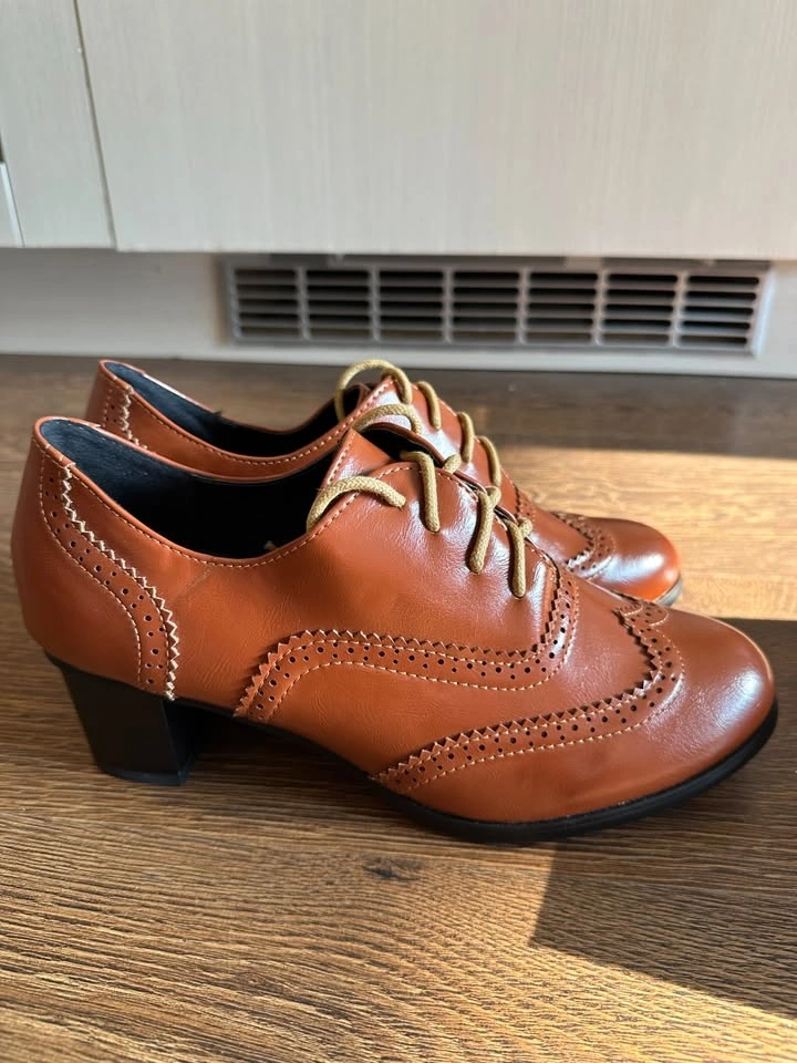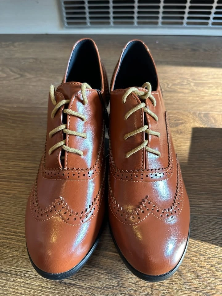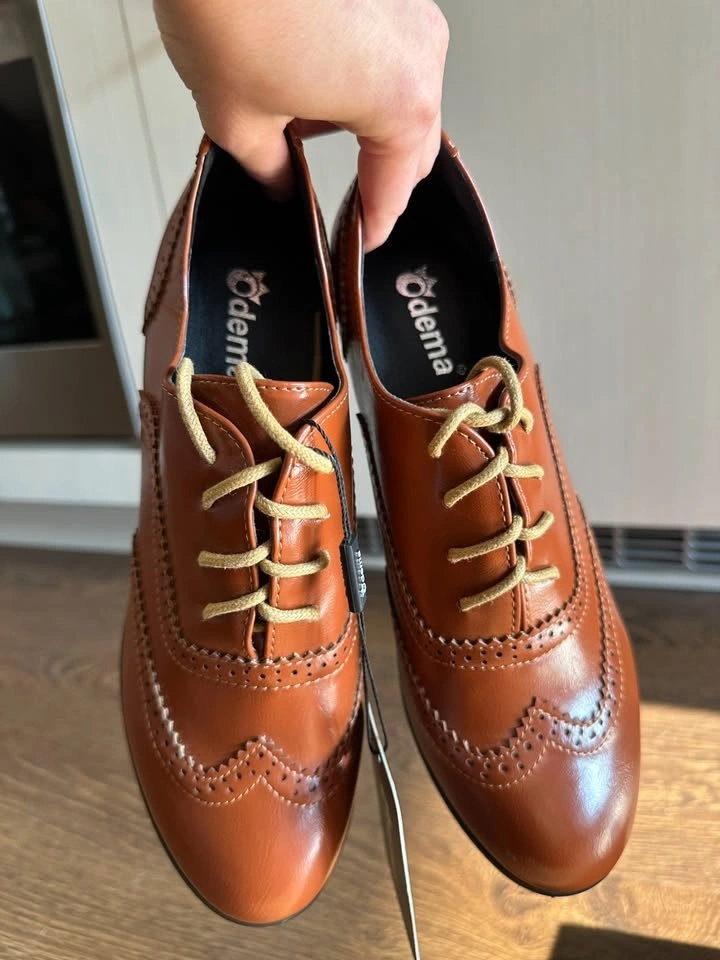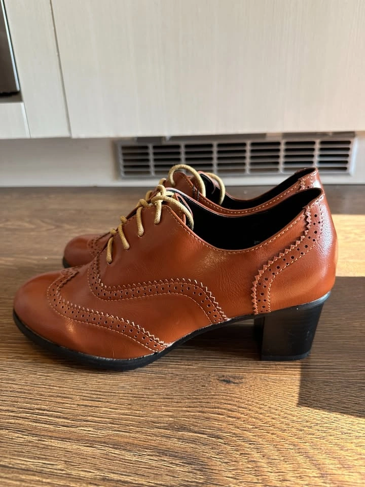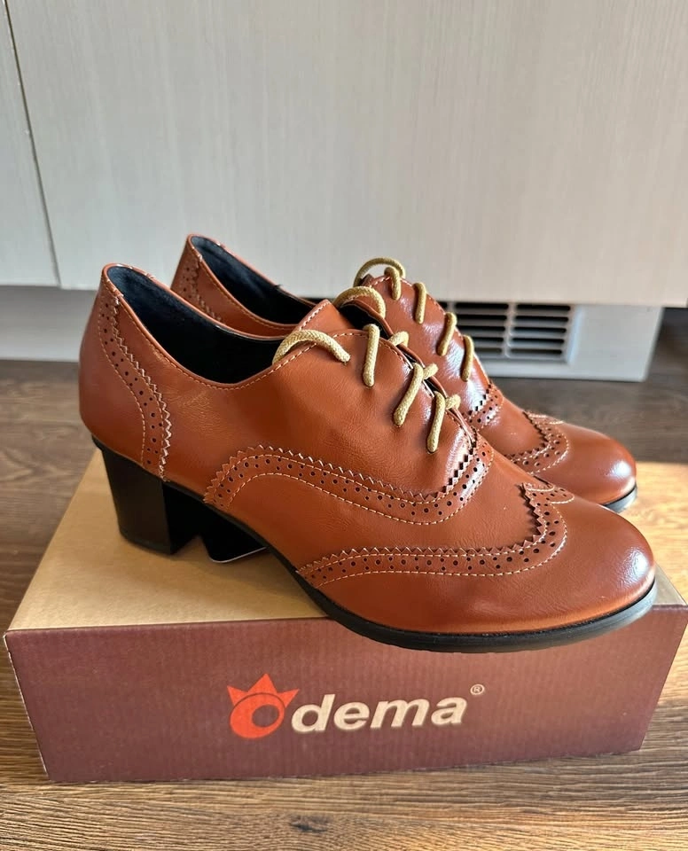 Brand new in box, never worn Odema brown brogue lace up Oxford tip and chunky heels leather shoes. Very cute, 50's vintage style shoes. Size: 8. Pickup in downtown Toronto.