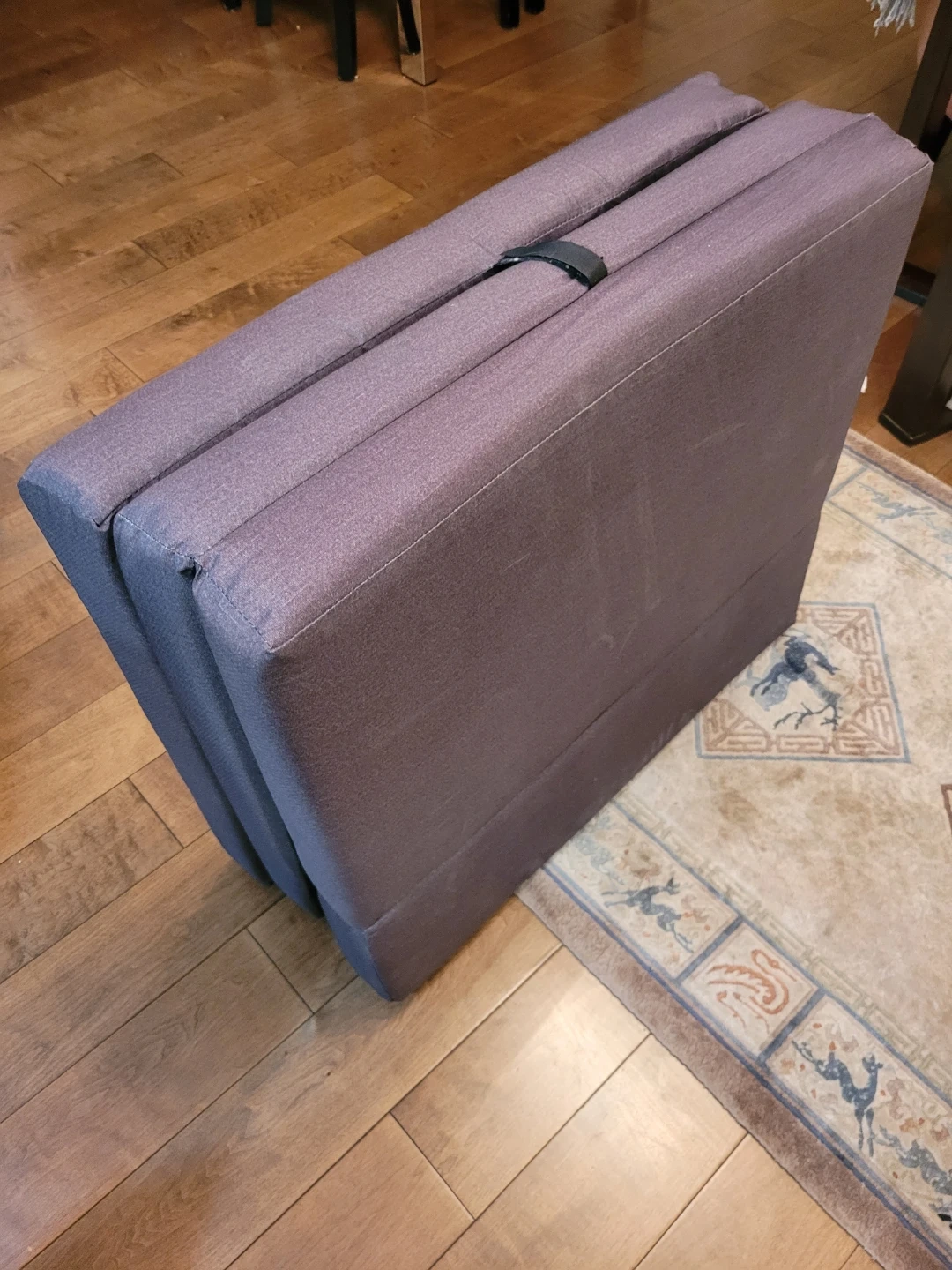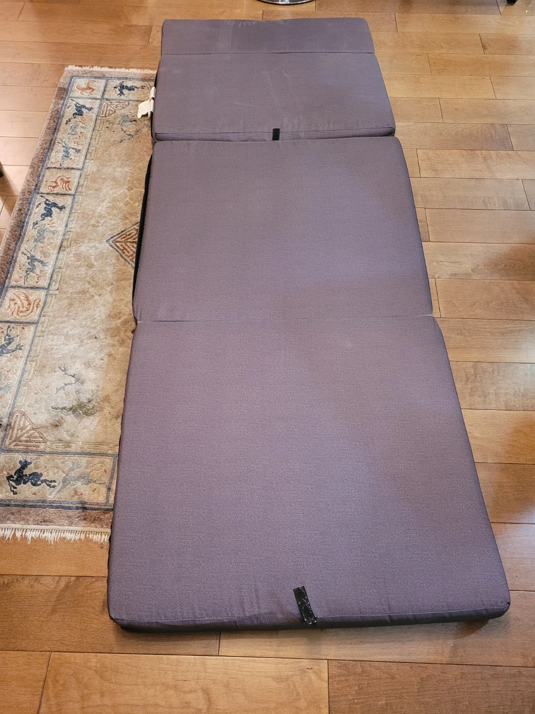 This tri-fold mattress offers a comfortable sleeping surface. It's upholstered in a durable grey fabric. Perfect for unexpected guests!