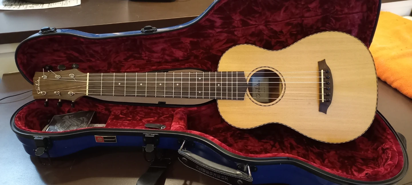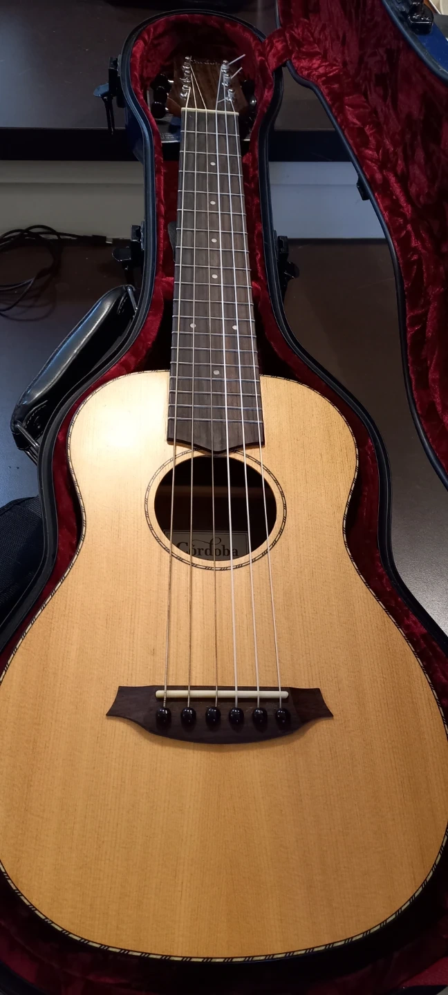 This Cordoba Mini II R nylon string guitar is a great choice for beginner musicians or anyone looking for a compact instrument. It features a beautiful natural finish and comes with a hard case for protection and easy transport. The guitar's construction ensures a warm and pleasant tone.