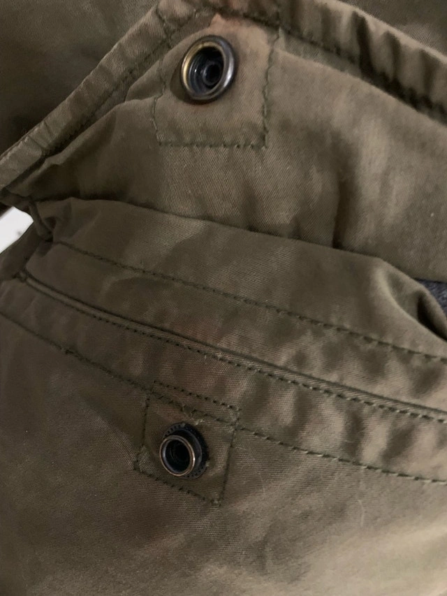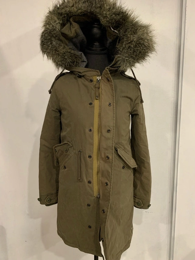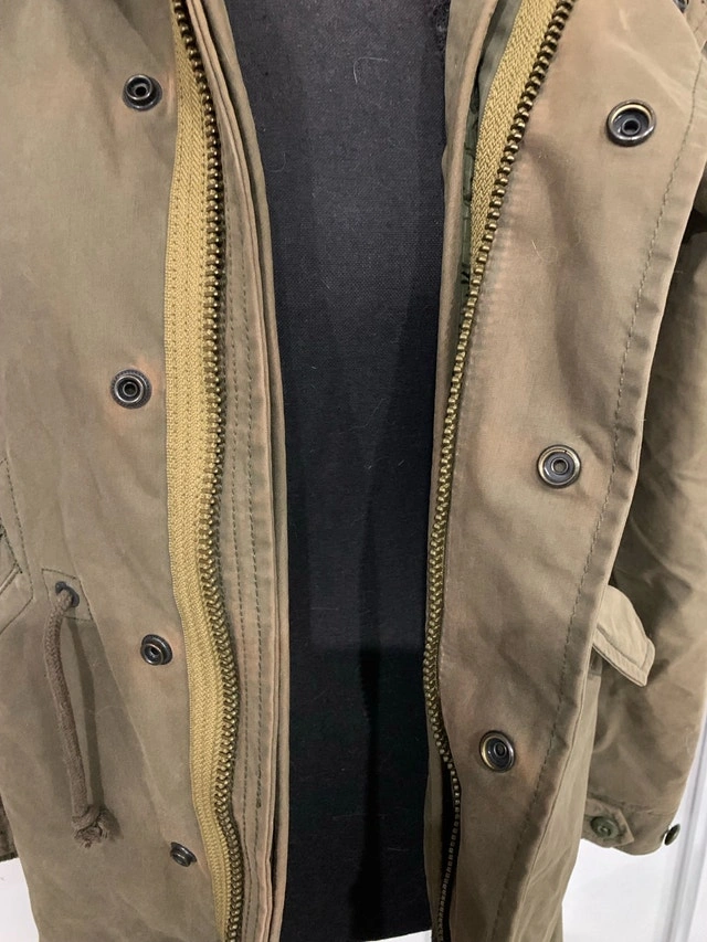 Some discolouration on clothing (see photo). There is a tiny hole almost invisible close to the pocket (see photo). Some pilling on jacket lining (see photo). This parka is on the heavier side. Size XXS, relaxed fit. Has been sitting in storage, so it might collect some dust and cat hairs. If you are allergic to cats and dusts, please consider before purchasing. No returns, exchanges, or changes. Pickup only, cash or e-transfer only. Pickup at Woodside Square at McCowan and Finch.