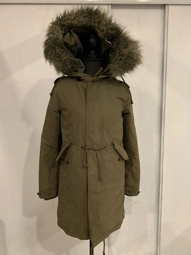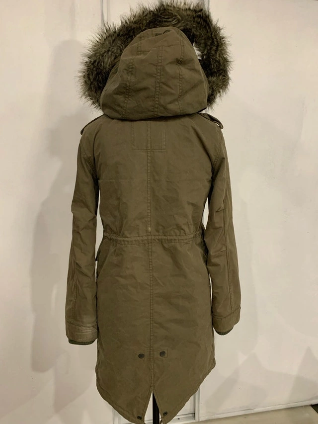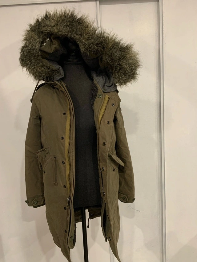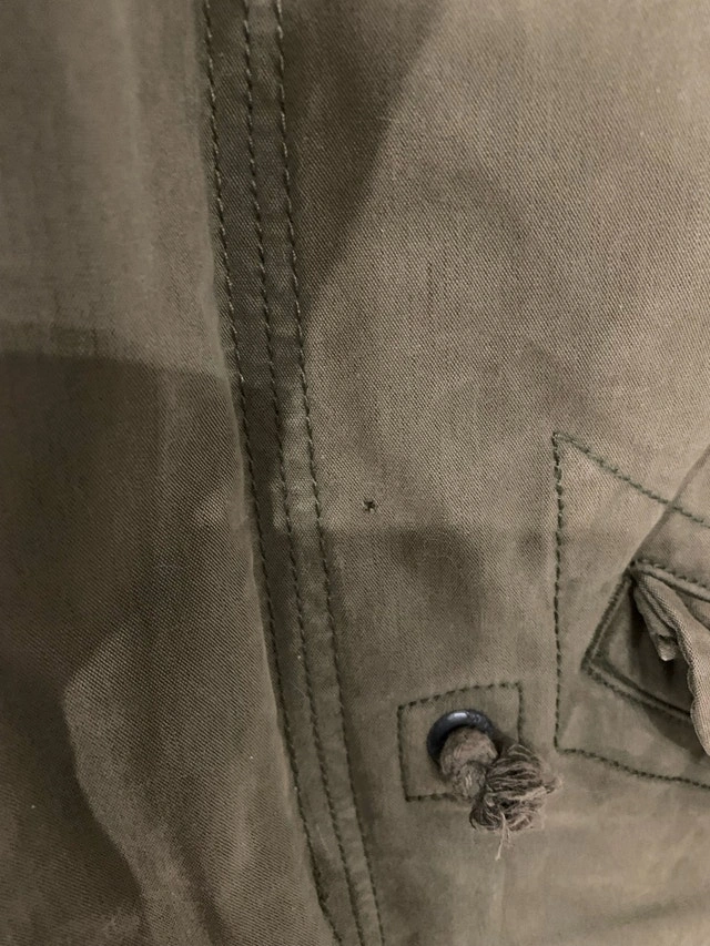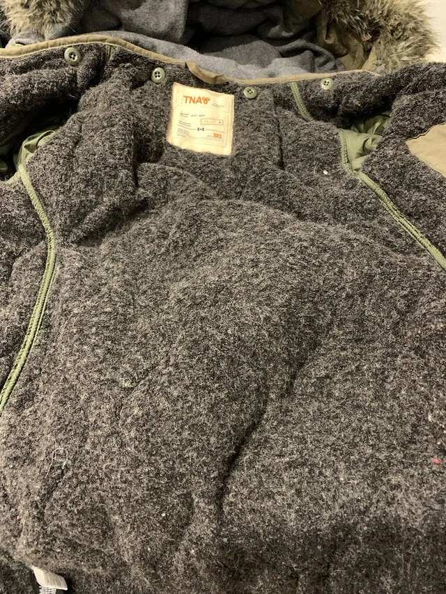 Some discolouration on clothing (see photo). There is a tiny hole almost invisible close to the pocket (see photo). Some pilling on jacket lining (see photo). This parka is on the heavier side. Size XXS, relaxed fit. Has been sitting in storage, so it might collect some dust and cat hairs. If you are allergic to cats and dusts, please consider before purchasing. No returns, exchanges, or changes. Pickup only, cash or e-transfer only. Pickup at Woodside Square at McCowan and Finch.