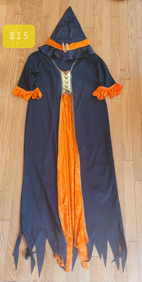 This is a witch costume with a long black cape and an orange dress underneath. The cape has a pointed hood and the dress has a gold lace-up front. The costume has a tattered look and is great for Halloween.