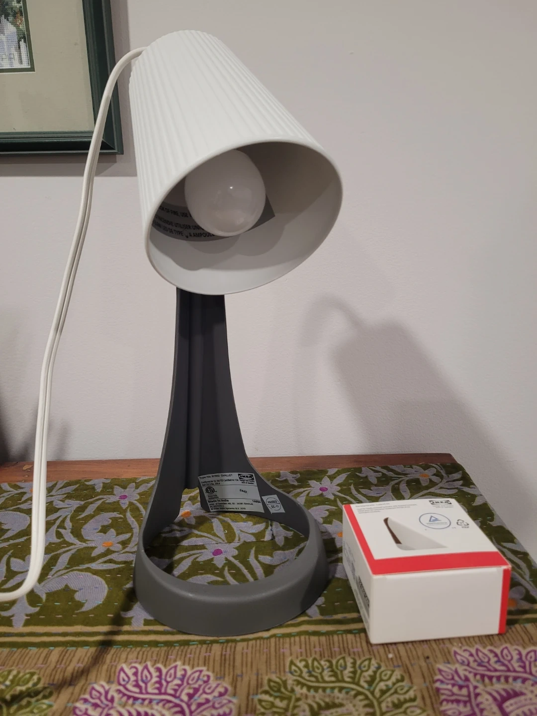 This is an IKEA SOLHETTA LED desk lamp with a white pleated shade and grey base. It's a simple and functional lamp, great for a desk or side table. It uses an E12 base bulb and is energy efficient.