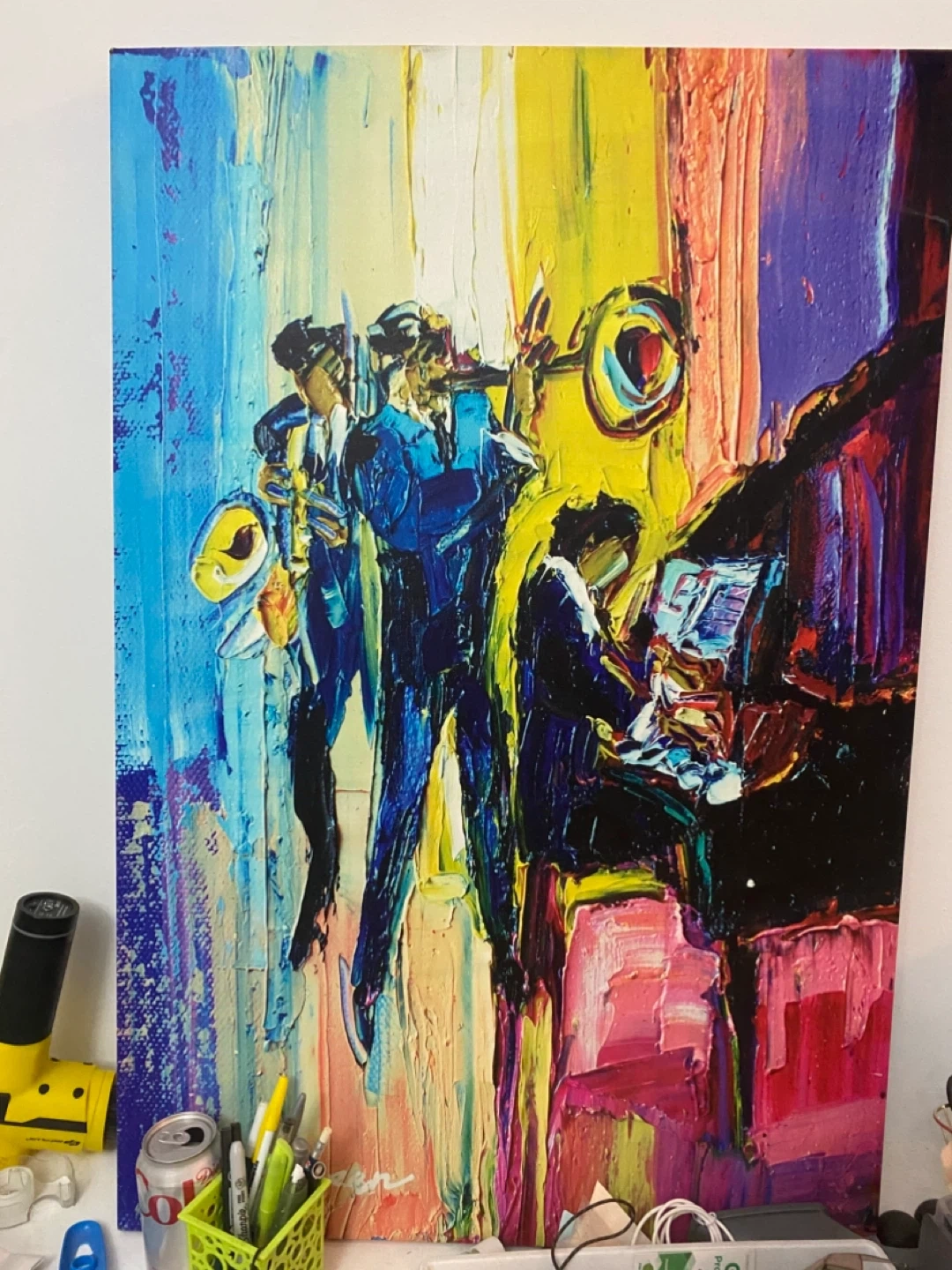 Vibrant canvas painting depicting an abstract jazz ensemble. Features bold strokes and a colourful palette. It's perfect for adding a lively touch to any room's decor.