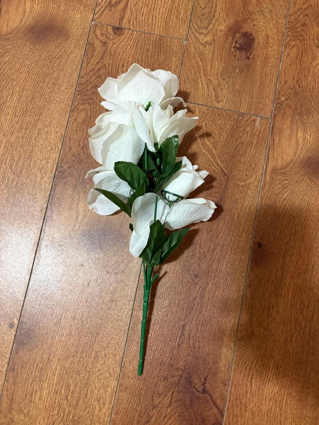 A bunch of artificial roses, featuring white and one red bloom. Each rose has fabric petals and plastic leaves on a green wire stem. They're great for decorating or crafts!