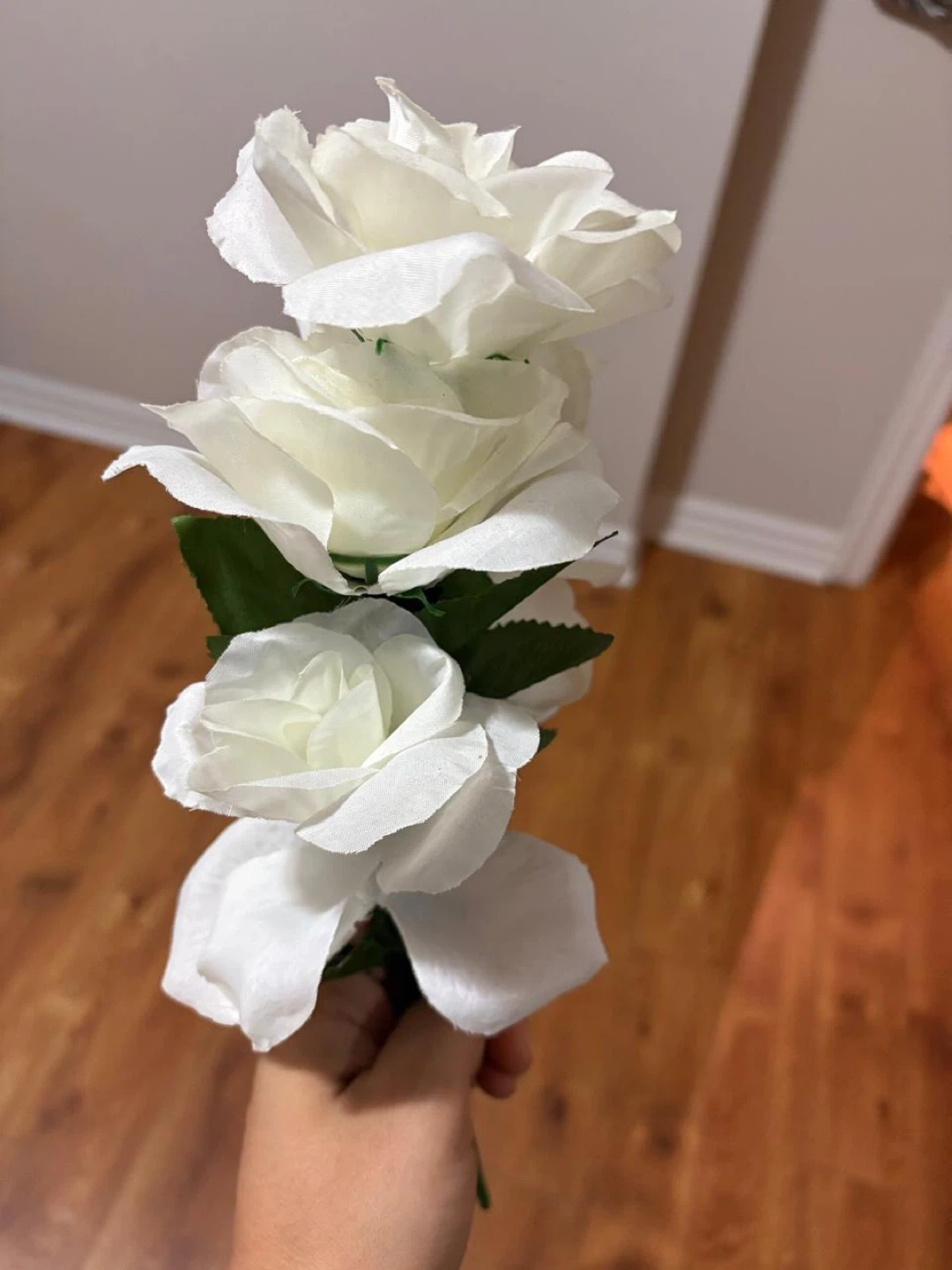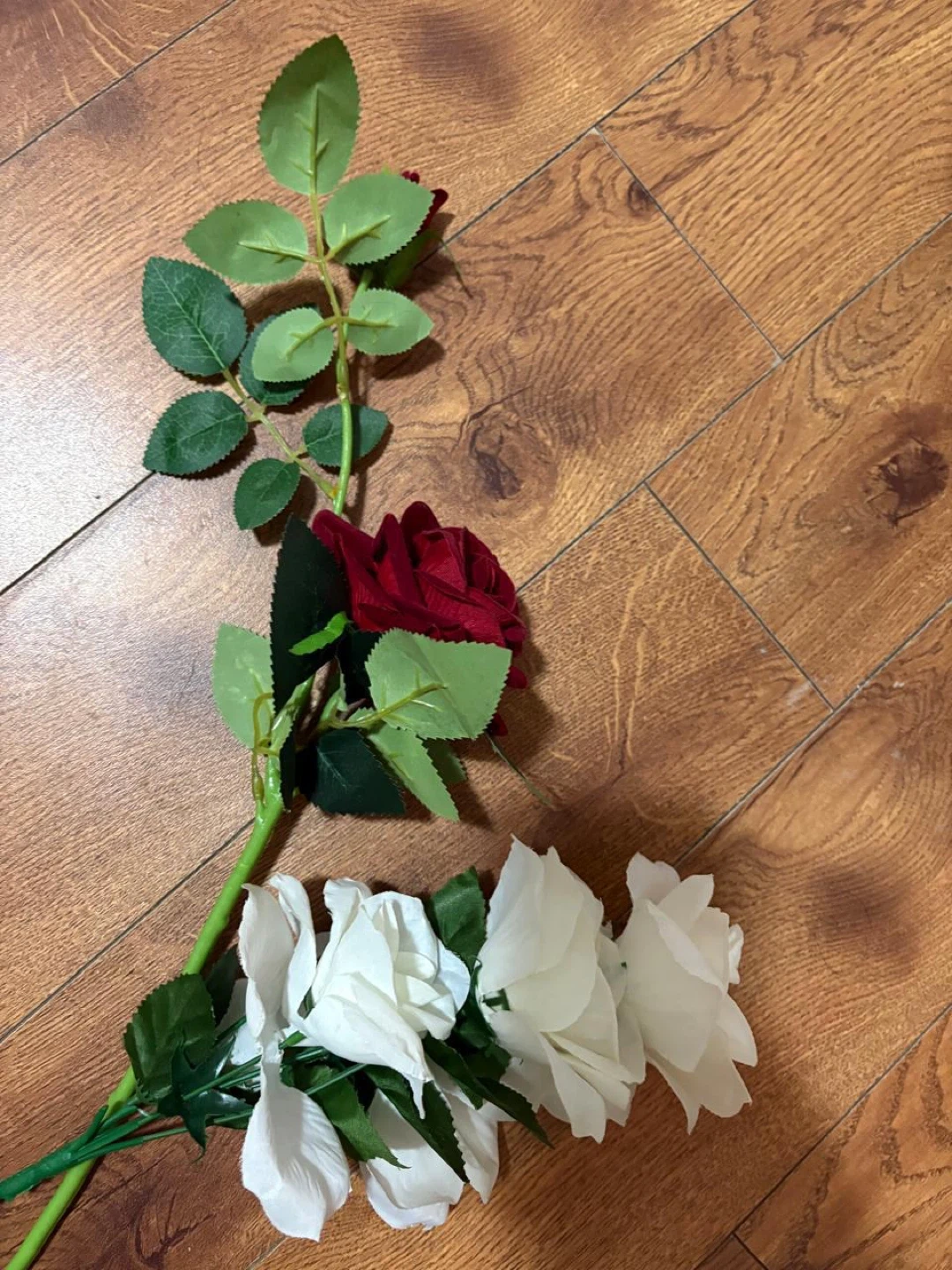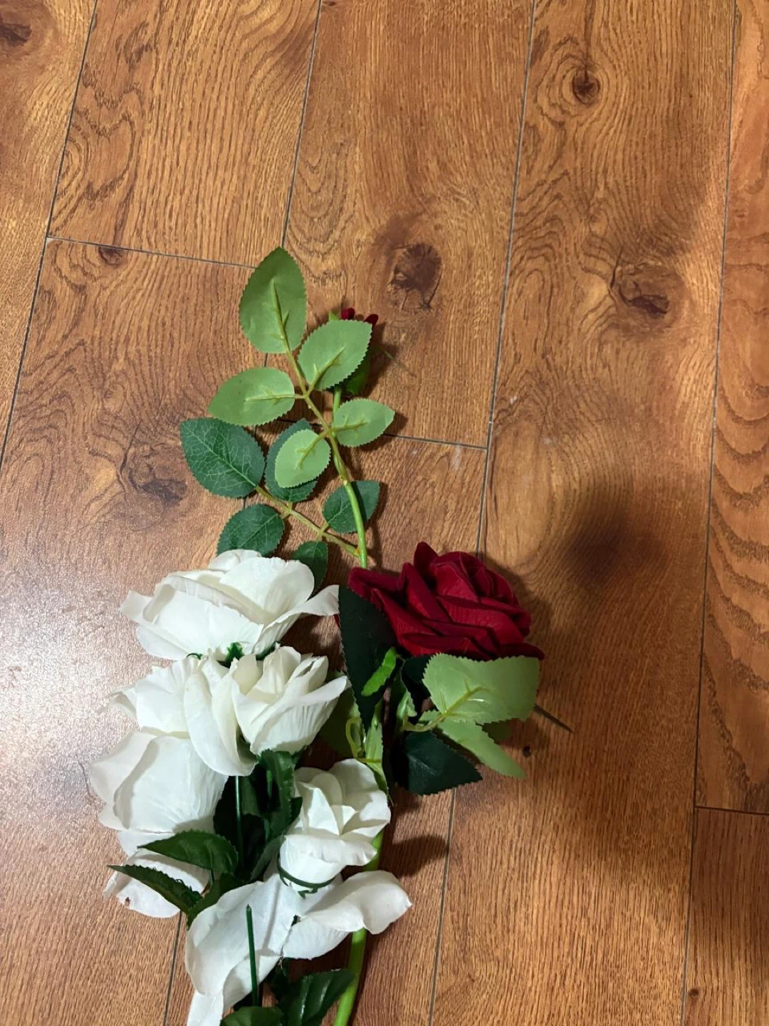 A bunch of artificial roses, featuring white and one red bloom. Each rose has fabric petals and plastic leaves on a green wire stem. They're great for decorating or crafts!