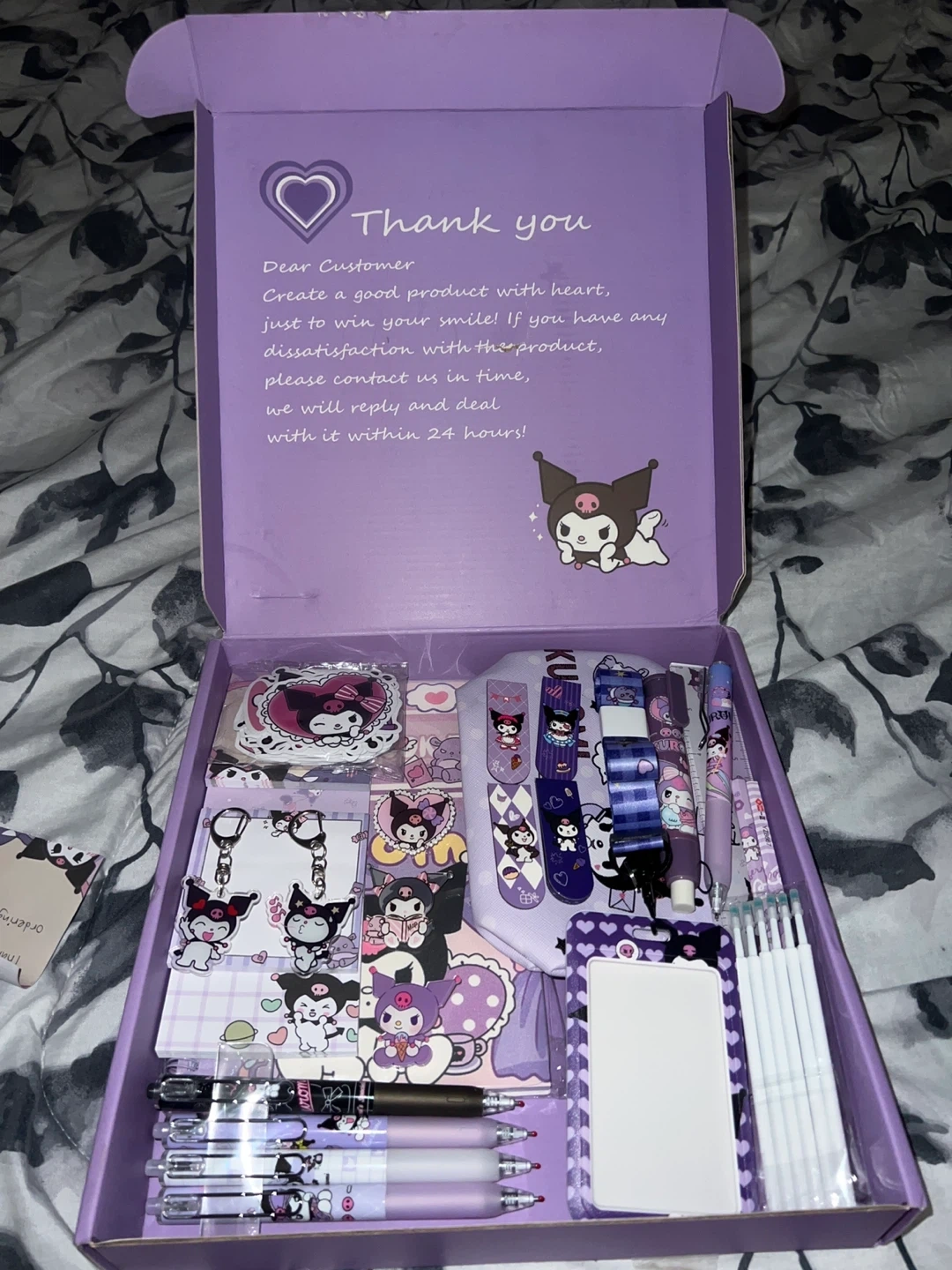 This is a cute Kuromi stationery set filled with pens, stickers, and other accessories. It includes several pens, decorative stickers, keychains, and bookmarks. Everything is in a lovely purple theme!