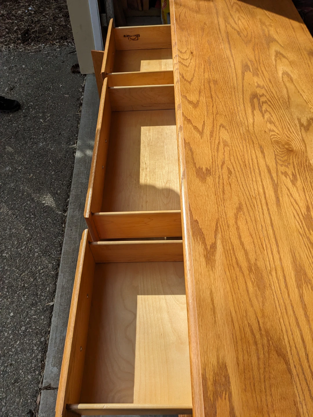 This dresser/cabinet combo in solid oak is in almost like new condition. It features 5 spacious drawers that all open and close perfectly and are in excellent condition inside.