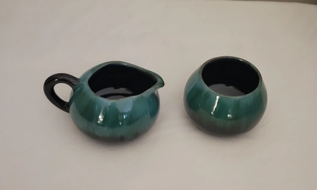 This is a Blue Mountain Pottery cream and sugar set. The set features a green glaze. It is in good condition.