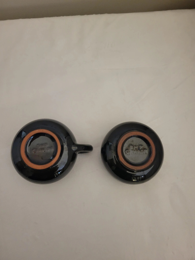 This is a Blue Mountain Pottery cream and sugar set. The set features a green glaze. It is in good condition.
