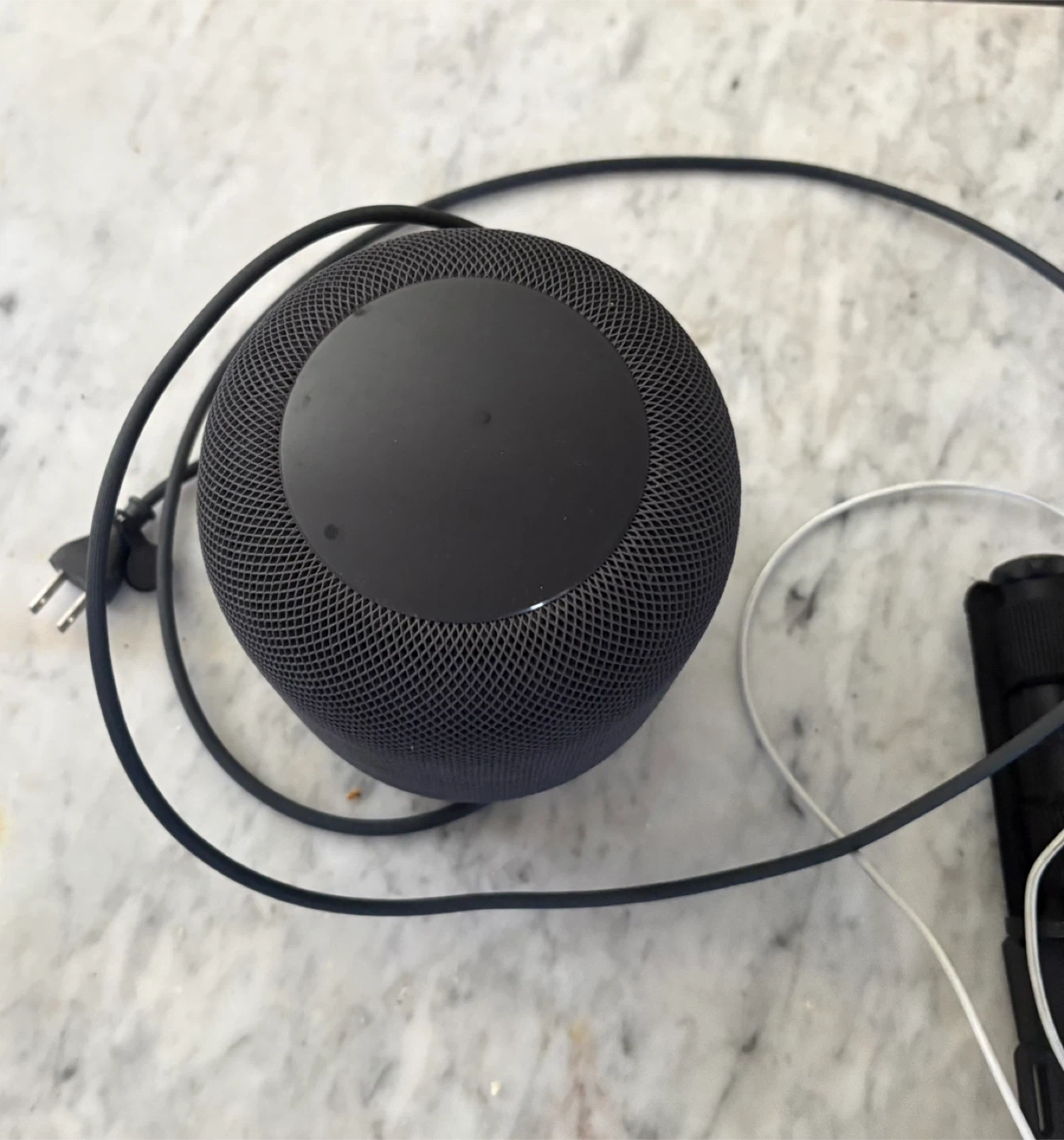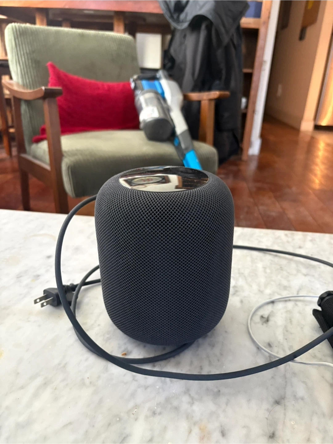 This is an Apple HomePod (2nd Generation) smart speaker in Space Gray. It's designed for high-fidelity audio and smart home control. The speaker is in good condition and includes its power cable.