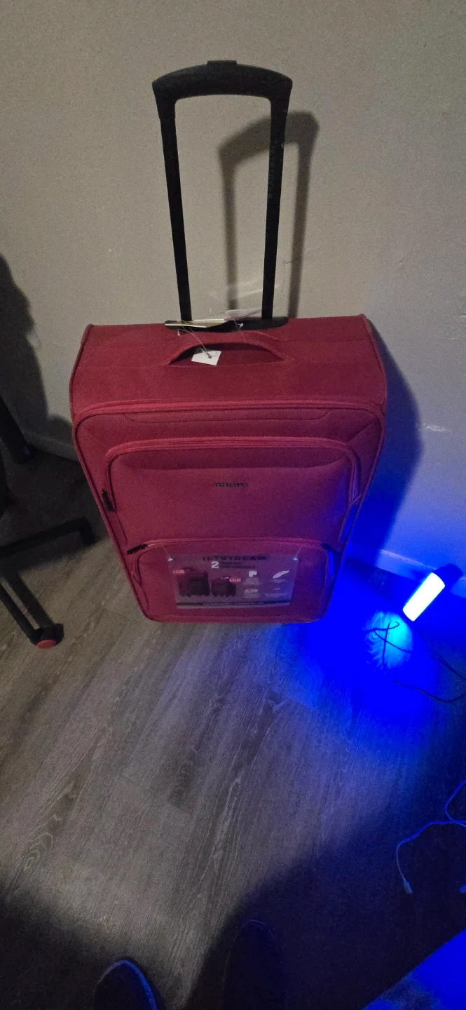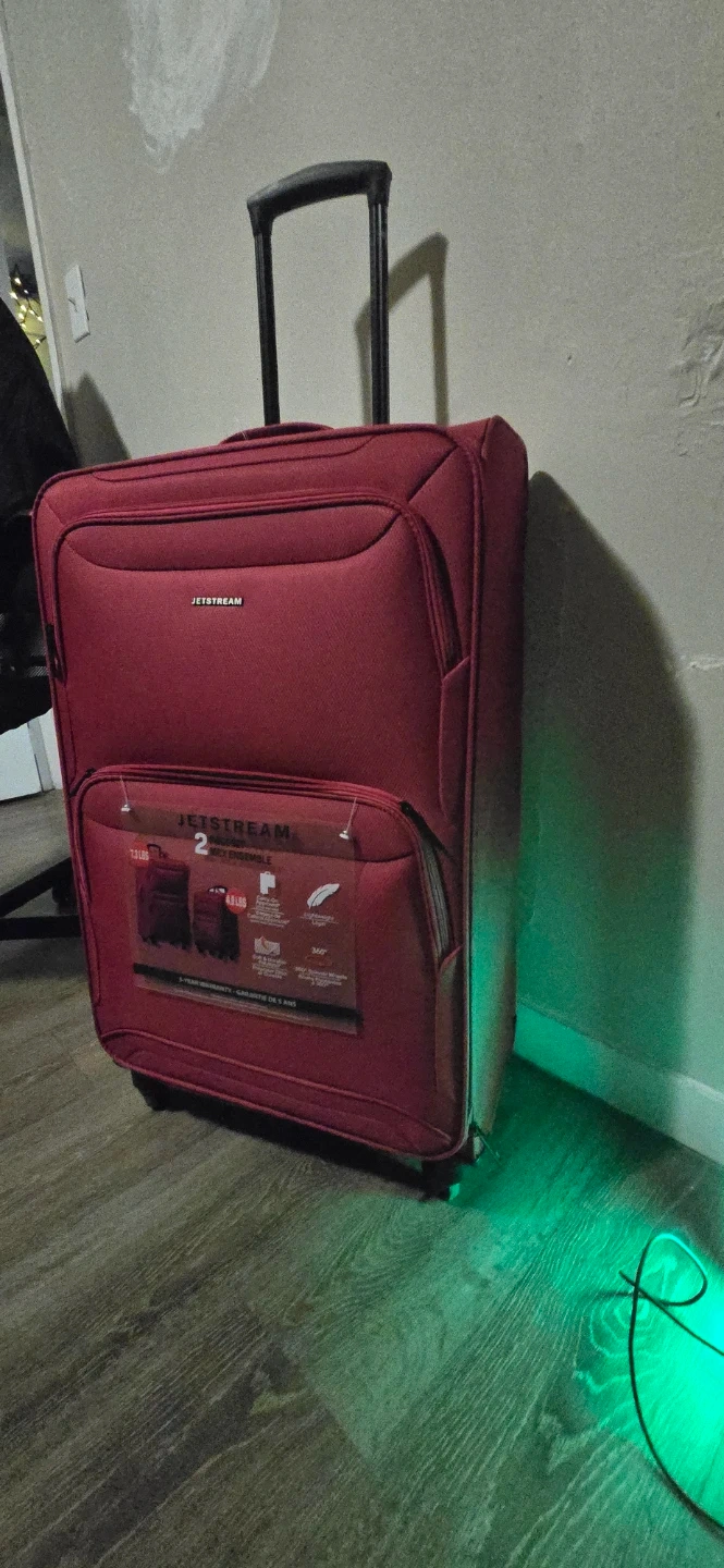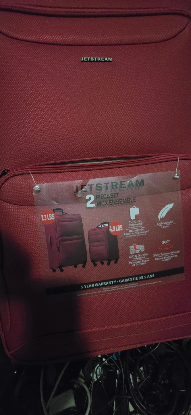 This is a 2-piece set of Jetstream lightweight spinner luggage in burgundy. It's designed for easy travel. The set includes a larger suitcase and a smaller carry-on size bag.