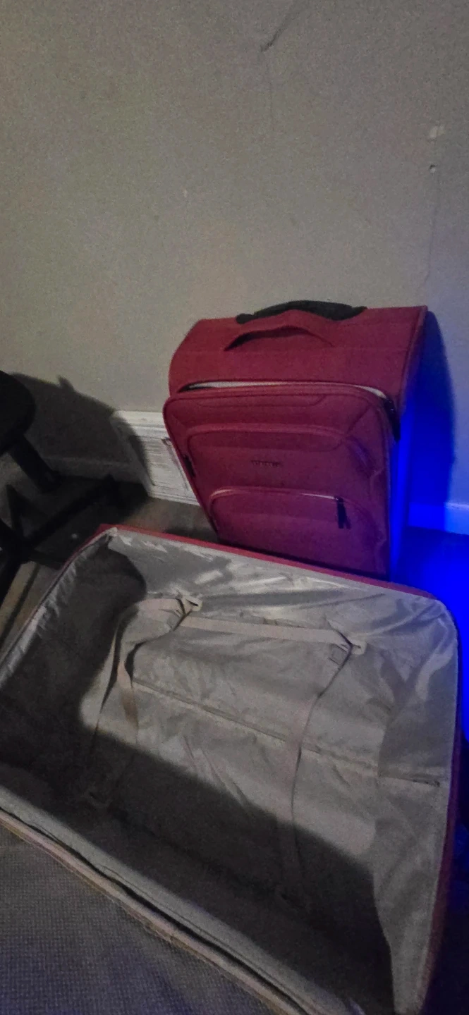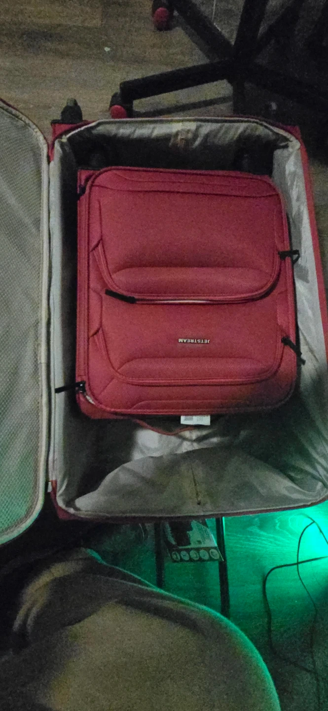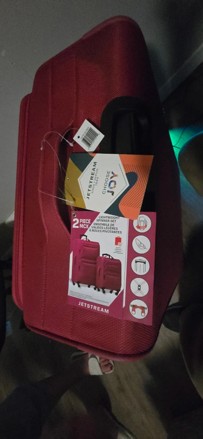 This is a 2-piece set of Jetstream lightweight spinner luggage in burgundy. It's designed for easy travel. The set includes a larger suitcase and a smaller carry-on size bag.