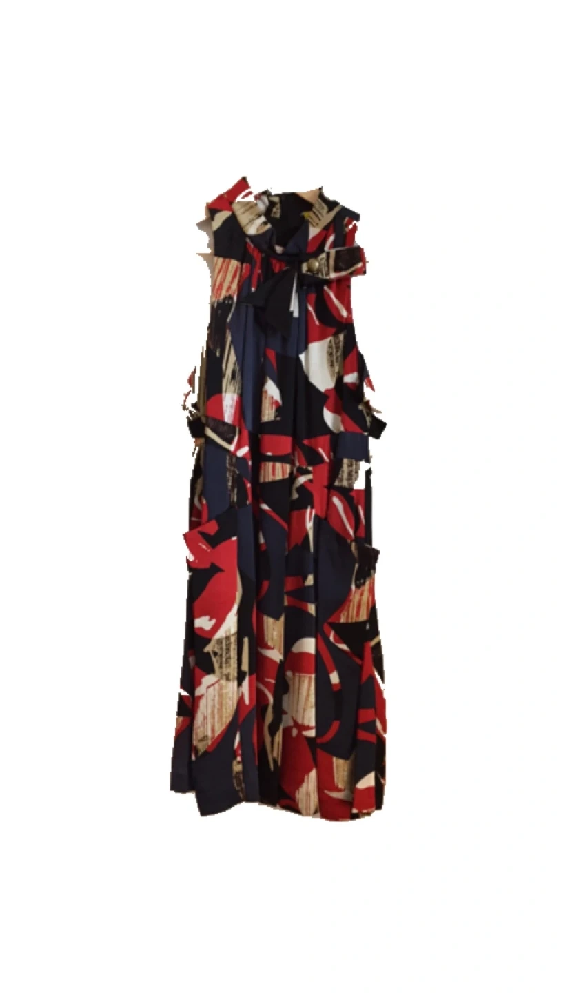 Here's a stylish dress with an eye-catching abstract print. It features a mix of red, navy, and beige tones. Perfect for adding a pop of colour to your wardrobe!