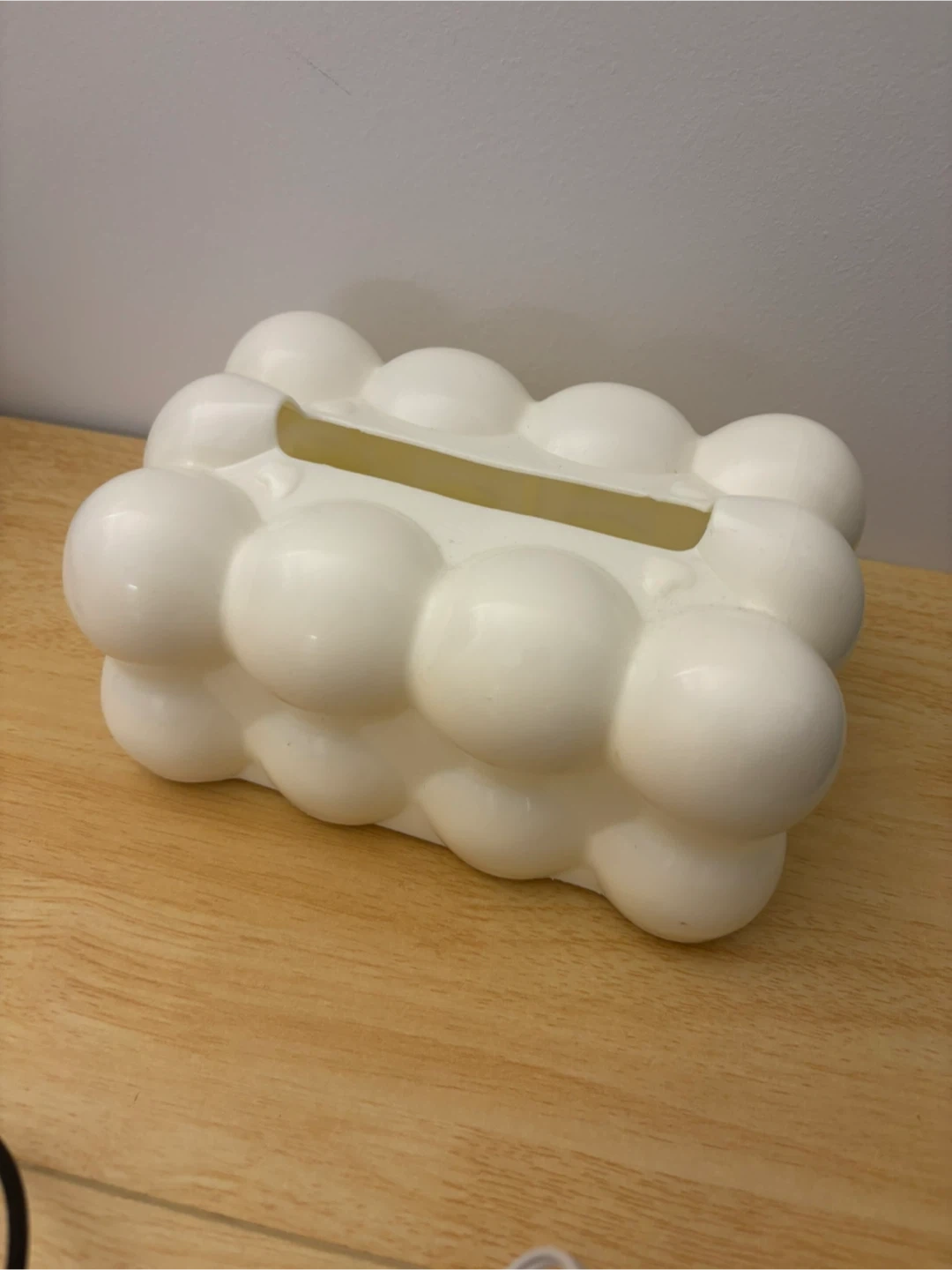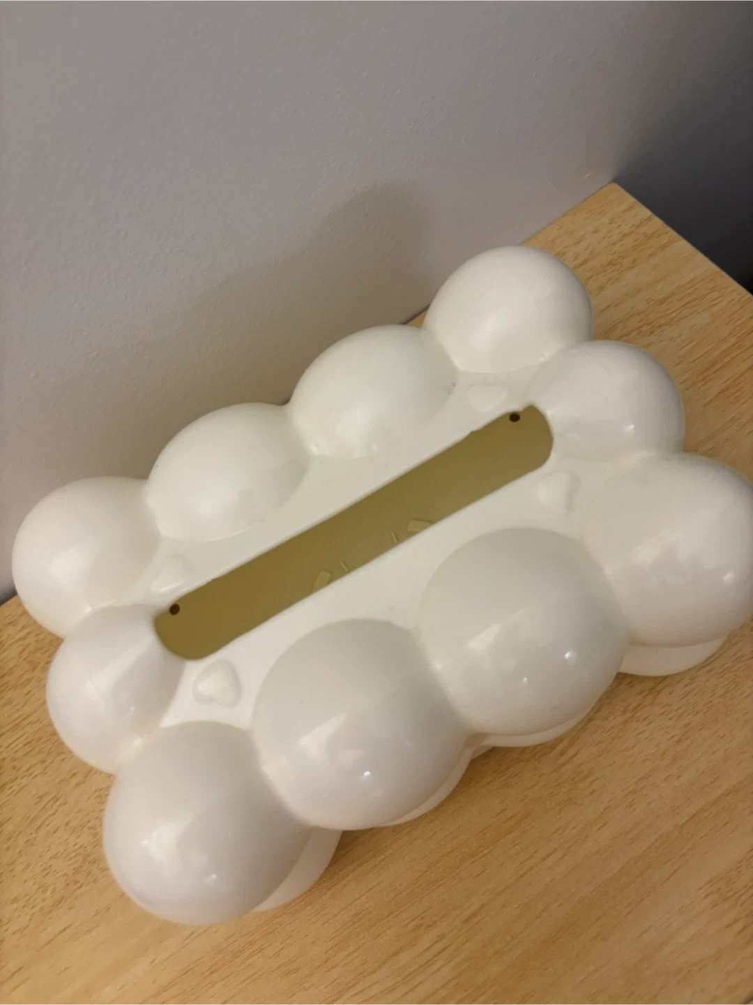 This tissue box cover has a fun, bubbly design. It's made of white plastic and will add a unique touch to any room. The opening measures approximately 5 inches long.
