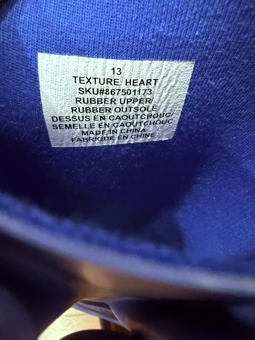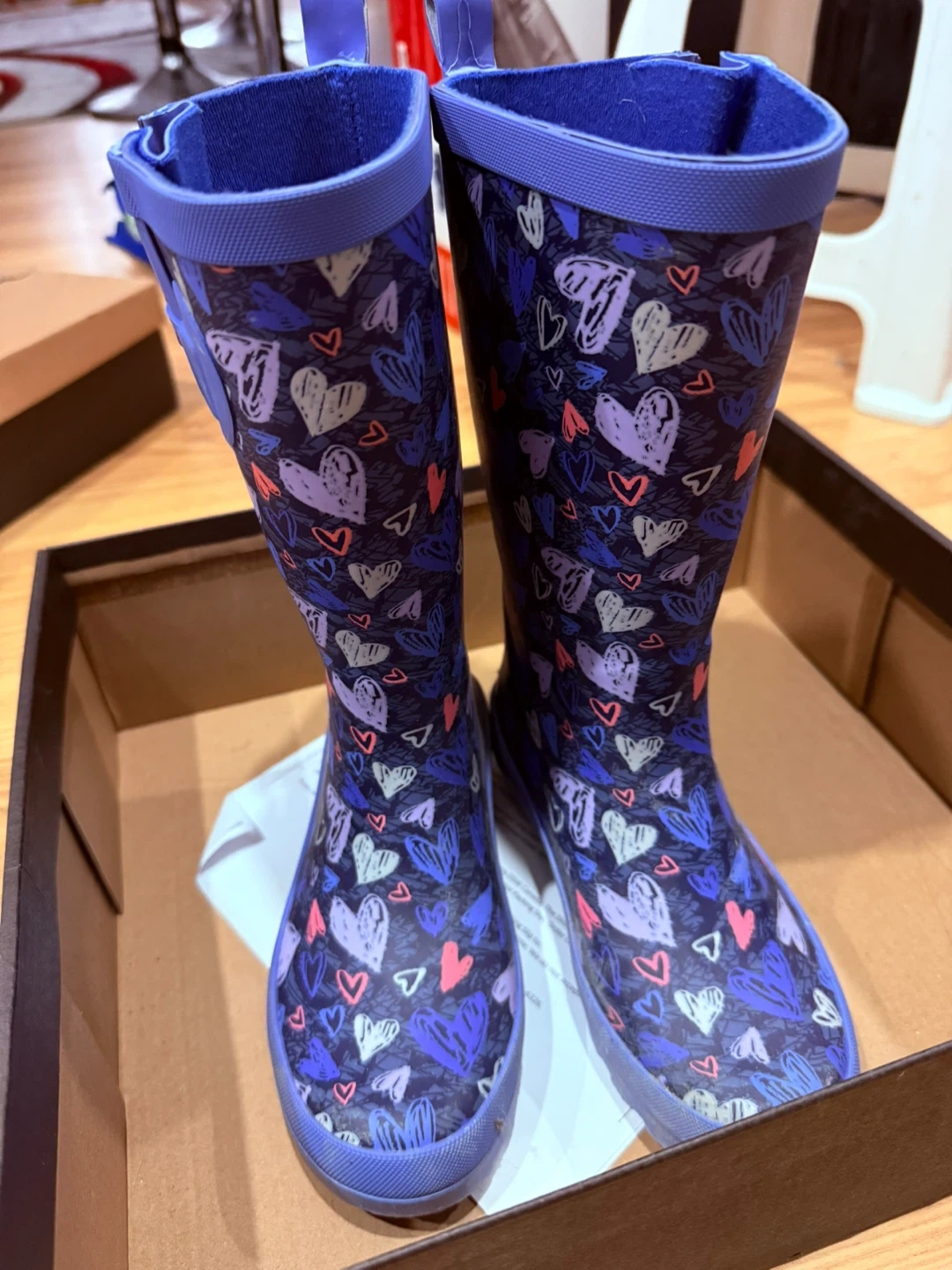 Blue rain boots with a multicolour heart pattern. Features a rubber upper and rubber outsole. Perfect for puddle jumping!