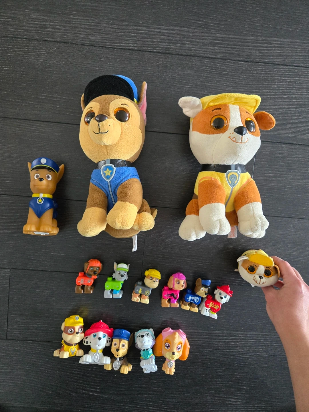 The whole set of Mega Construx paw Patrol Figures. Chase light up changing colour light. And full set of other paw Patrol Figures. One small beanie boo of Rubble.