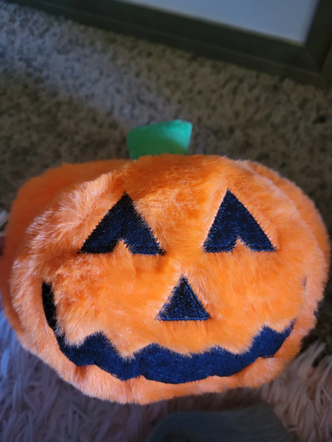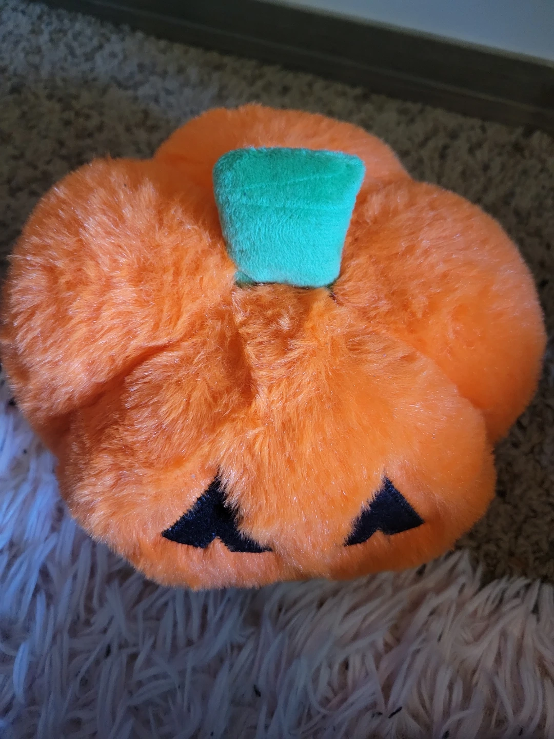 This is a fuzzy plush toy shaped like a Halloween pumpkin. It has embroidered features for the face and a green stem on top. It's soft and squishy!