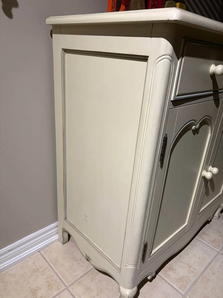 Gorgeous vintage dining set, professionally refurbished. Perfect for a kitchenette or condo. Cream color with beautiful details. Purchased new for $4500. The table is round, 42 inches in diameter. Chairs are solid wood with excellent quality rattan seats. Both table and chair seats were always covered, so they are in excellent condition with no scratches. This is a truly beautiful and unique set of superior quality and craftsmanship. Open to reasonable offers