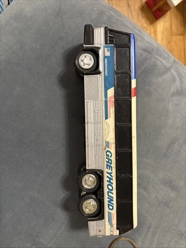 This is a vintage Greyhound diecast toy bus that also functions as a piggybank. It features a detailed bus design and is great for kids to save their change. It has some marks on it.