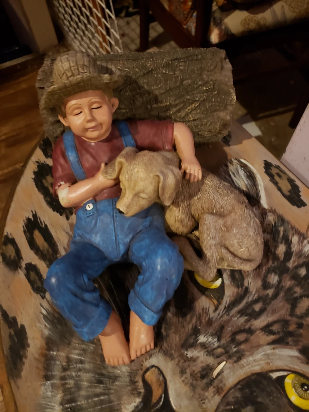 This is a charming figurine of a boy sleeping with his dog. It would be a great addition to any collection or as a standalone decorative piece
