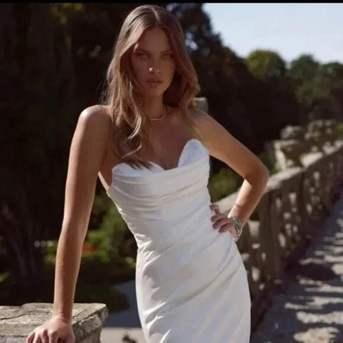 COLOUR: IVORY. NUMBER: 24-003(3). Perfect for the minimalist bride. SIZE: This beautiful dress was made for a women’s size 4 and it was not altered. Alterations can definitely be made. Made for a women's size 4, 32C BUST, 26” Waist, 37” Hip. Usually a size small, 5’2 height but this overhangs at the front and shoes are completely covered when I am wearing this (4” heels). Made in Ukraine.
