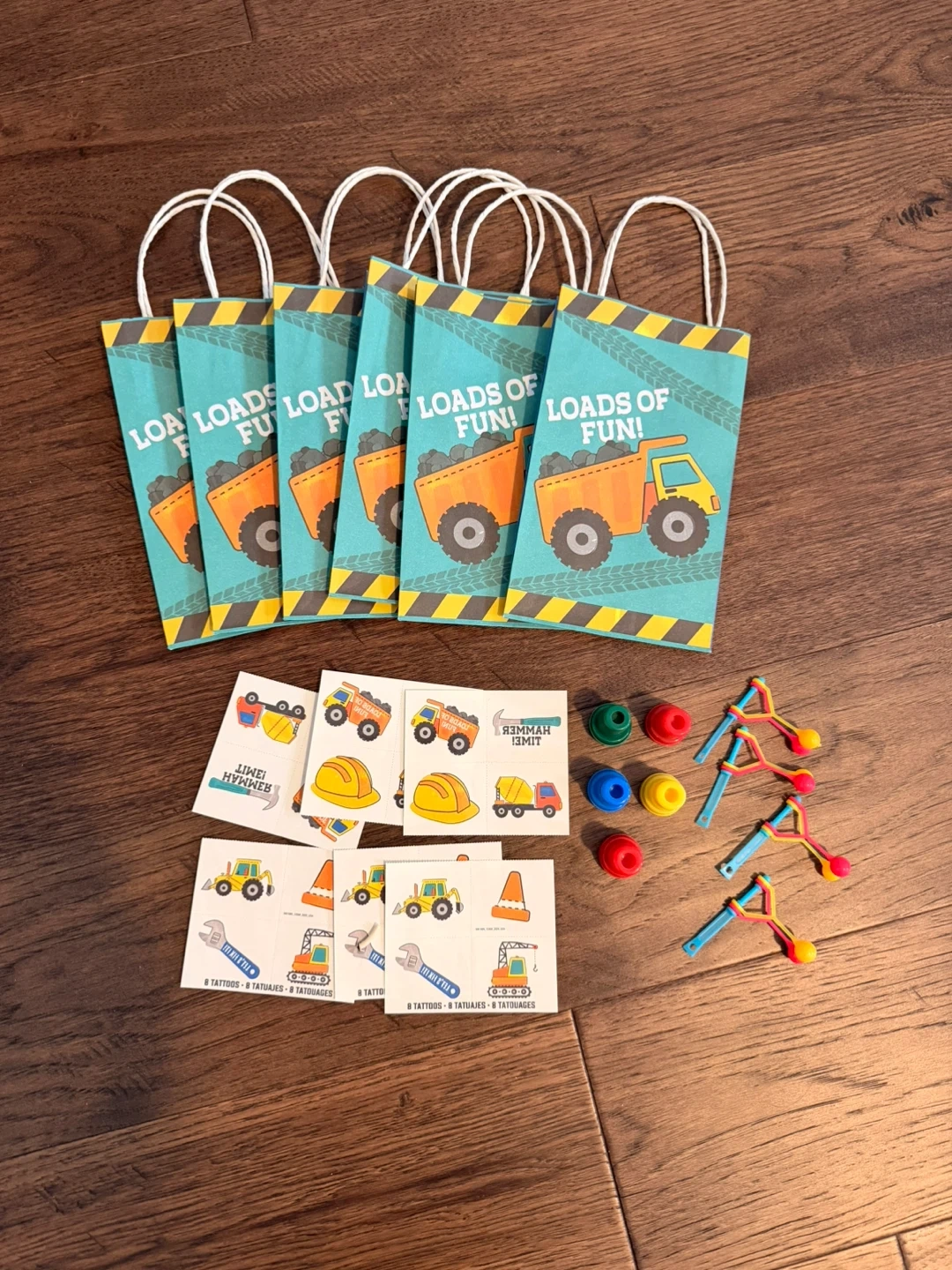 This set includes 6 construction-themed party favor bags with 'Loads of Fun!' printed on them. It also comes with 10 mini toys and assorted temporary tattoos featuring construction vehicles and hard hats. Perfect for a child's construction-themed birthday party!