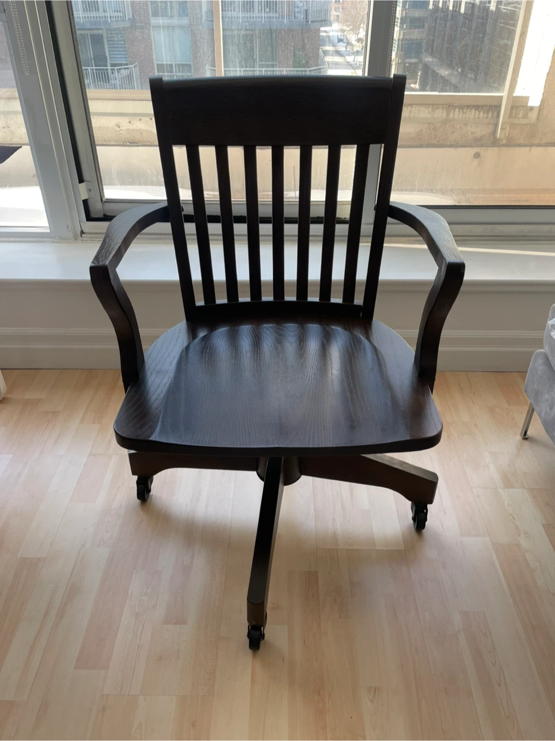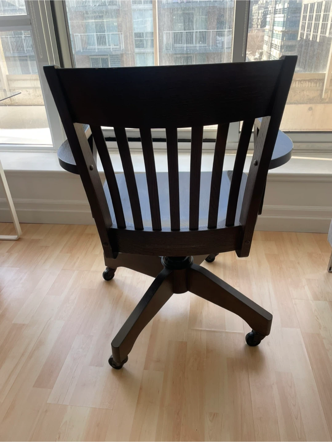 Solid oak stained dark. On casters with swivel and height adjustable features. With armrests and full backrest. Has a classic design.