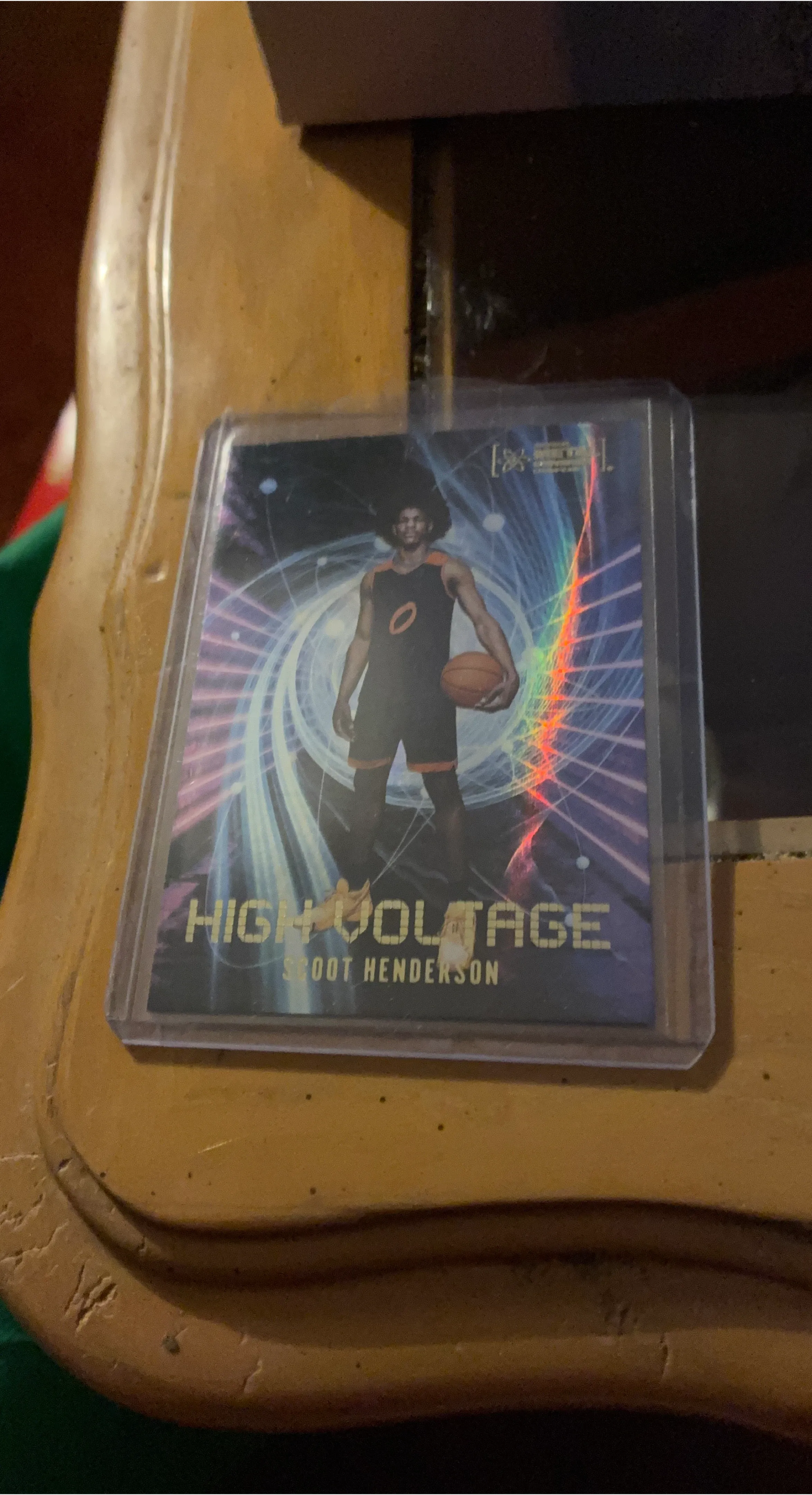 This is a basketball trading card featuring Scoot Henderson with a 'High Voltage' design. The card is in a protective sleeve. It's a collectible item for basketball fans.