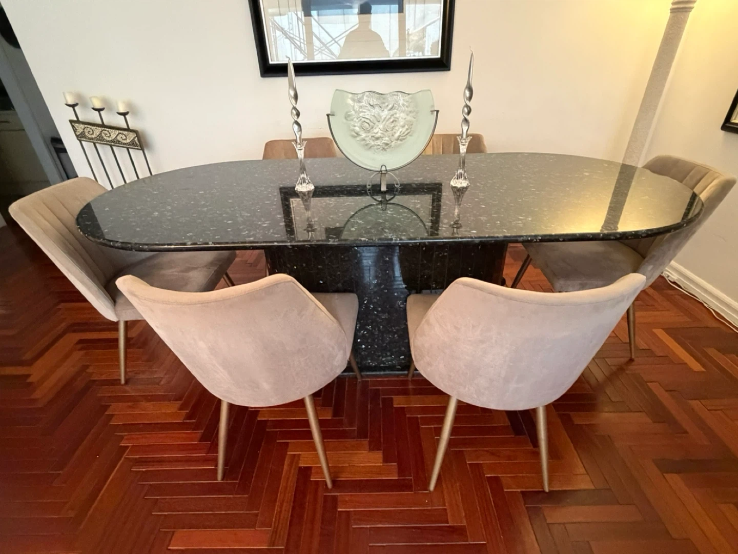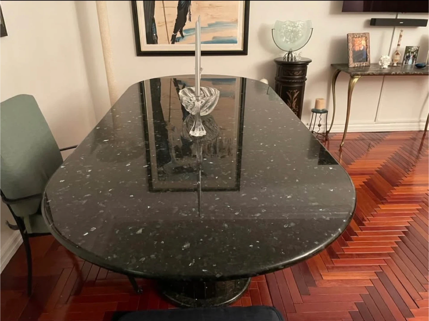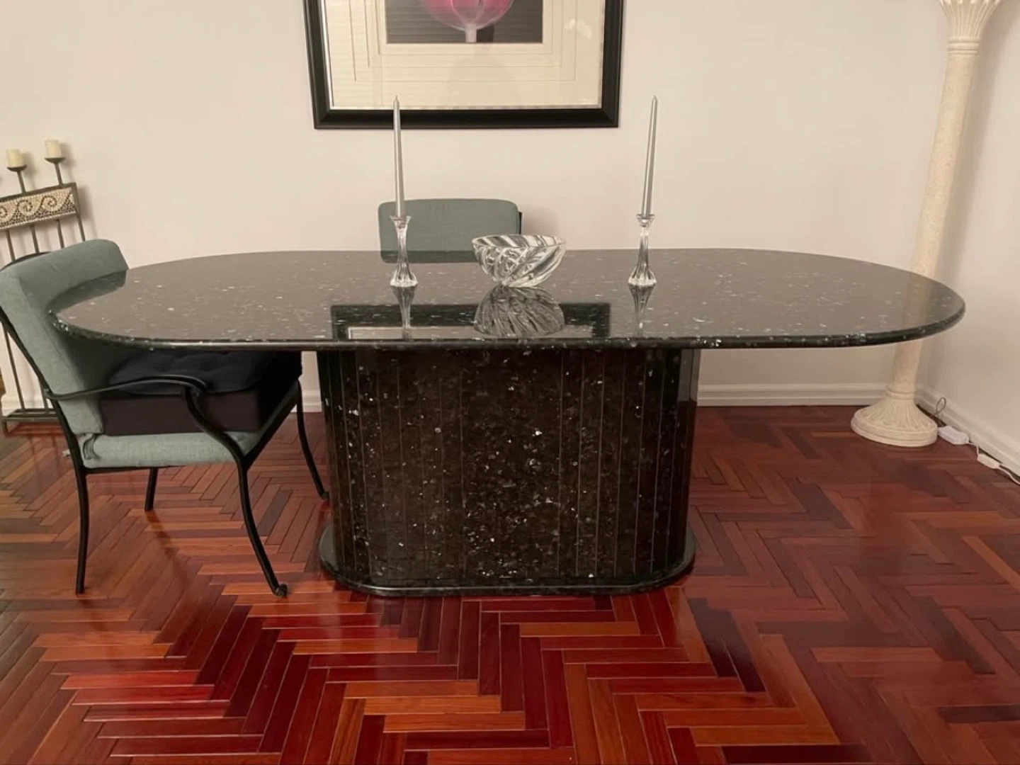 7.5’ Black Granite Dining Table w/ Opalescent Flecks + 6 Chairs