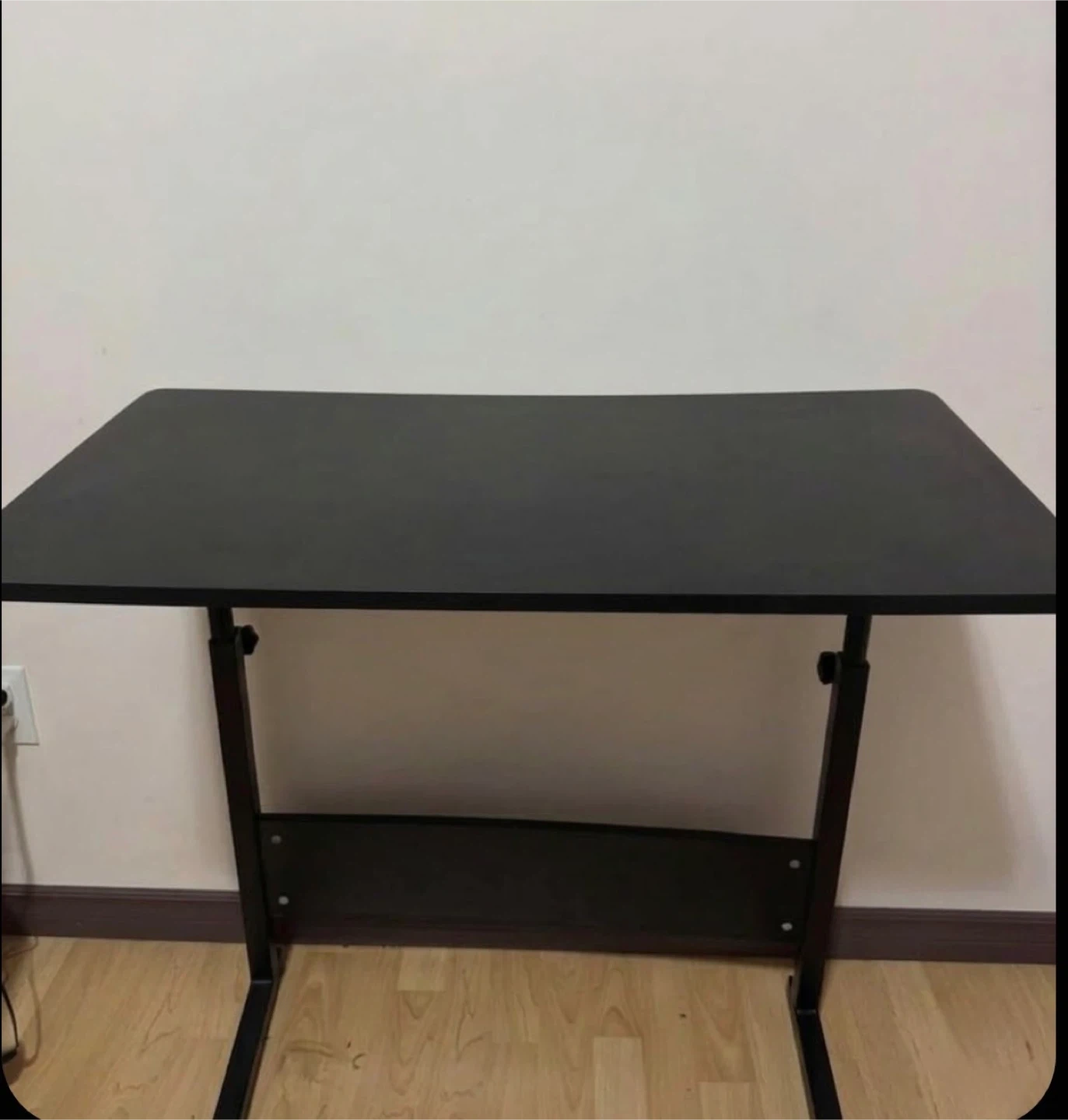 This is a black desk with an adjustable height feature - so you can turn it into a standing desk. It has a sturdy metal frame. suitable for a home office setup.