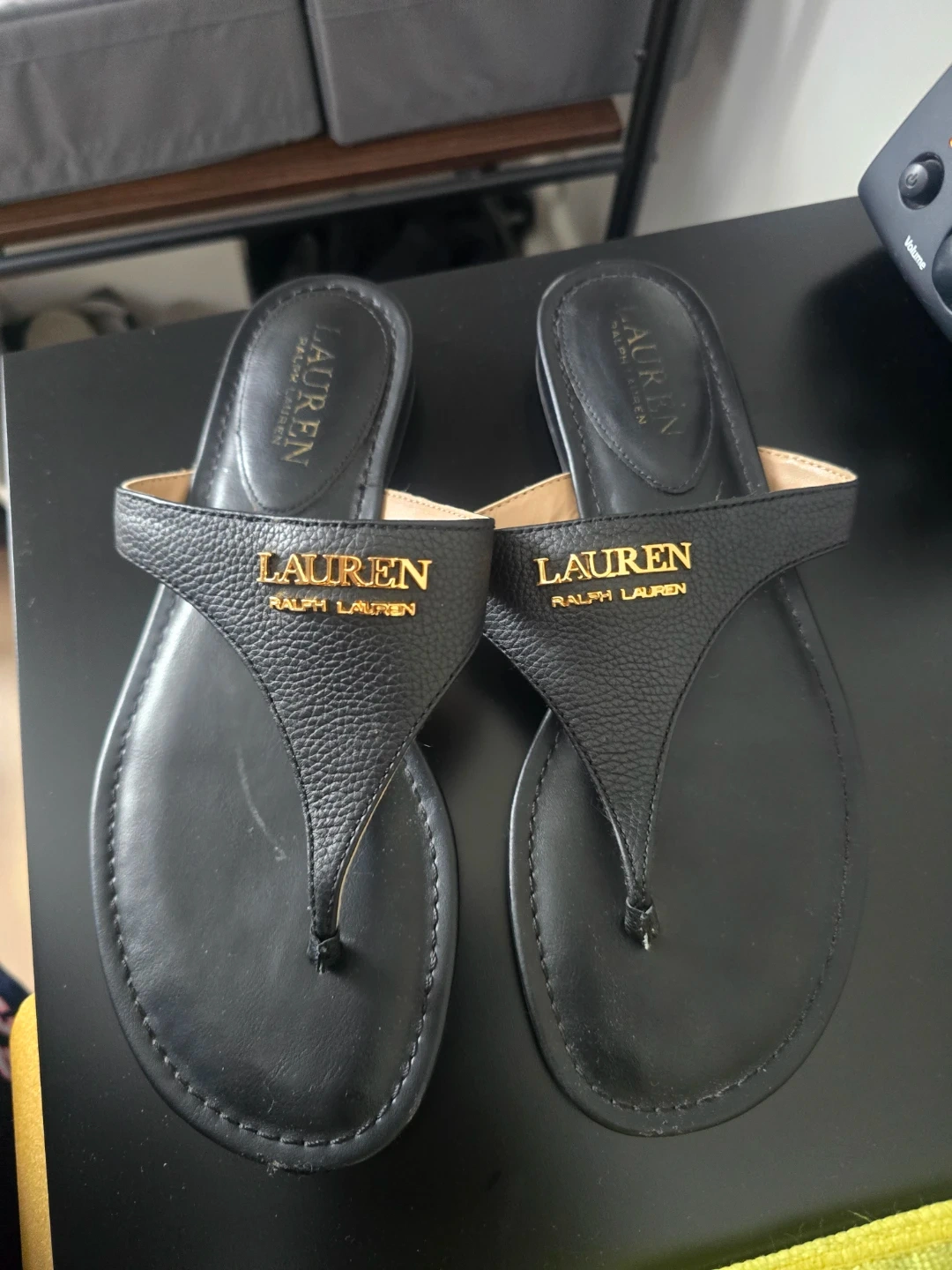 Selling a pair of Ralph Lauren Ellah sandals in black. They are size 7. The upper is 100% cow leather and the lining is 100% polyurethane. The original price was $59.50