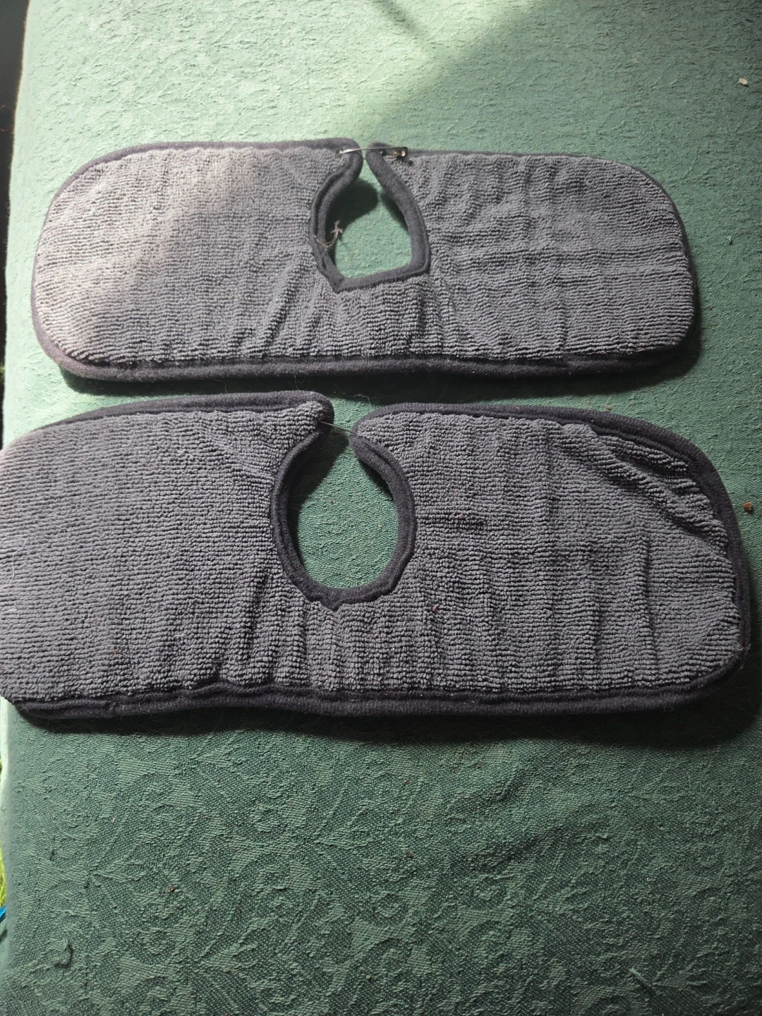 These are two grey microfiber covers designed to fit around faucet handles. They're made of a soft, absorbent material and have a loop to secure them. They help protect your hands and keep your sink area clean. The material is microfiber.