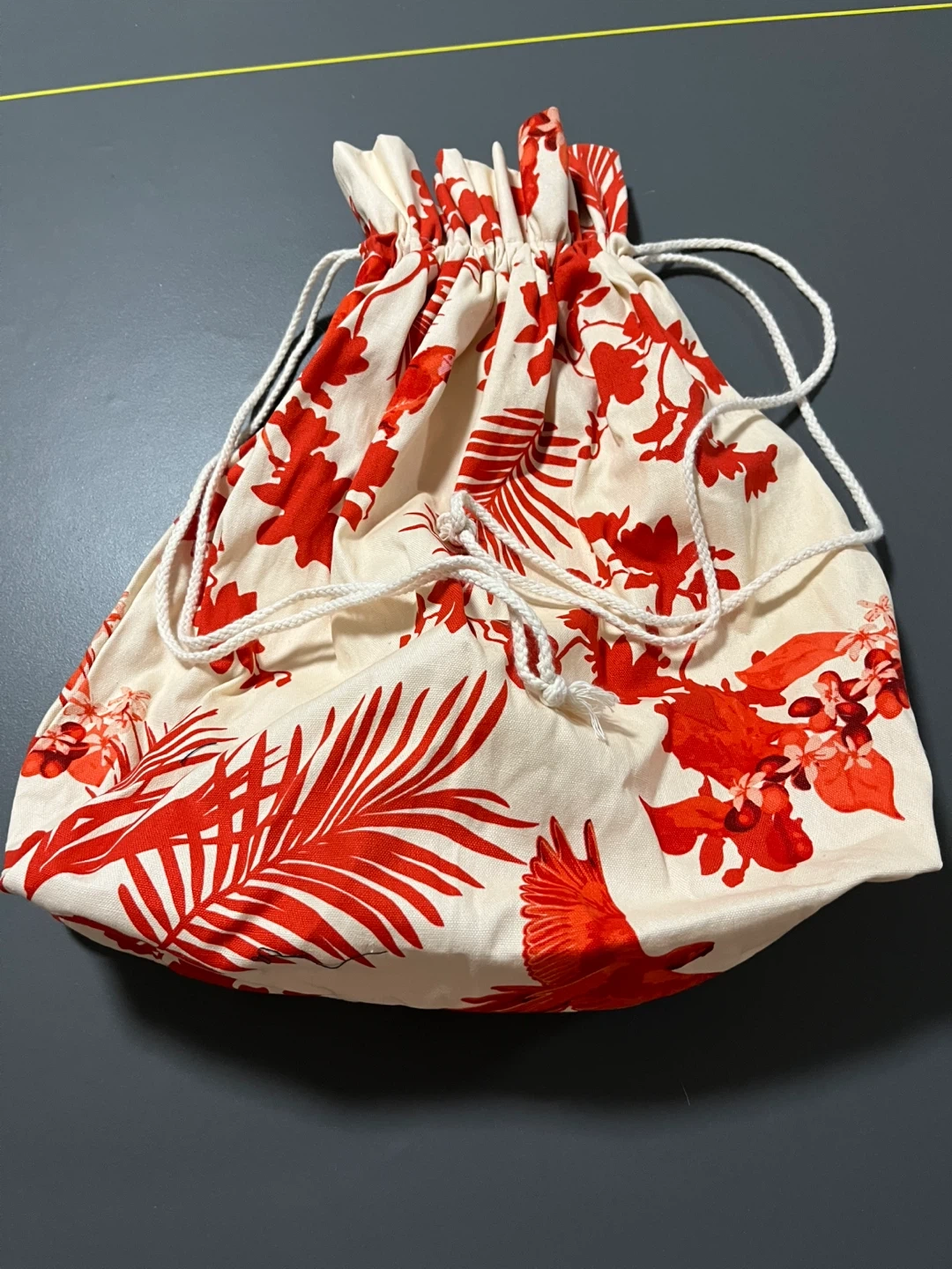 Here's a Nespresso drawstring bag designed in collaboration with Johanna Ortiz! It features a vibrant red floral and bird pattern on a cream background. Perfect for carrying small items or as a reusable shopping bag
