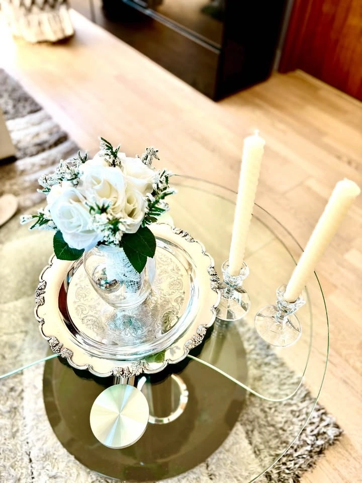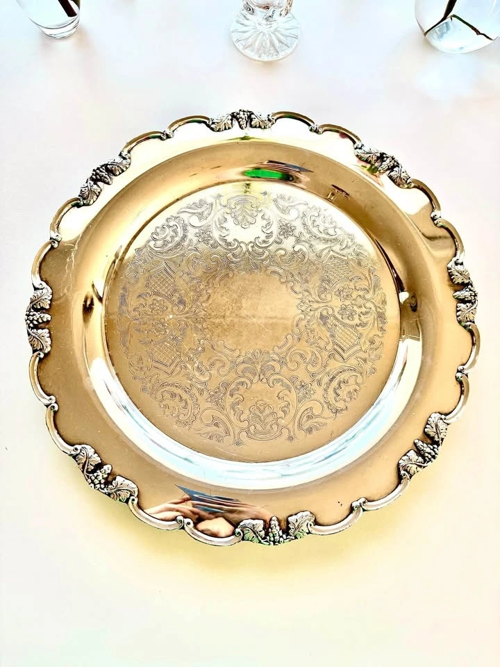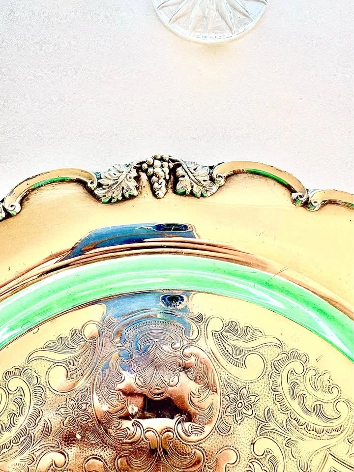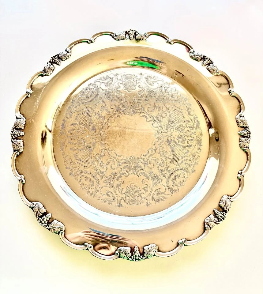 Features a beautiful engraved center design, scalloped edges, and grape leaf details. Made of electroplated copper and marked on the bottom. Great for serving snacks or as a decorative display piece. Can easily be brought back to a nice shine with metal or silver polish. Vase and candlestick holder sold separately.