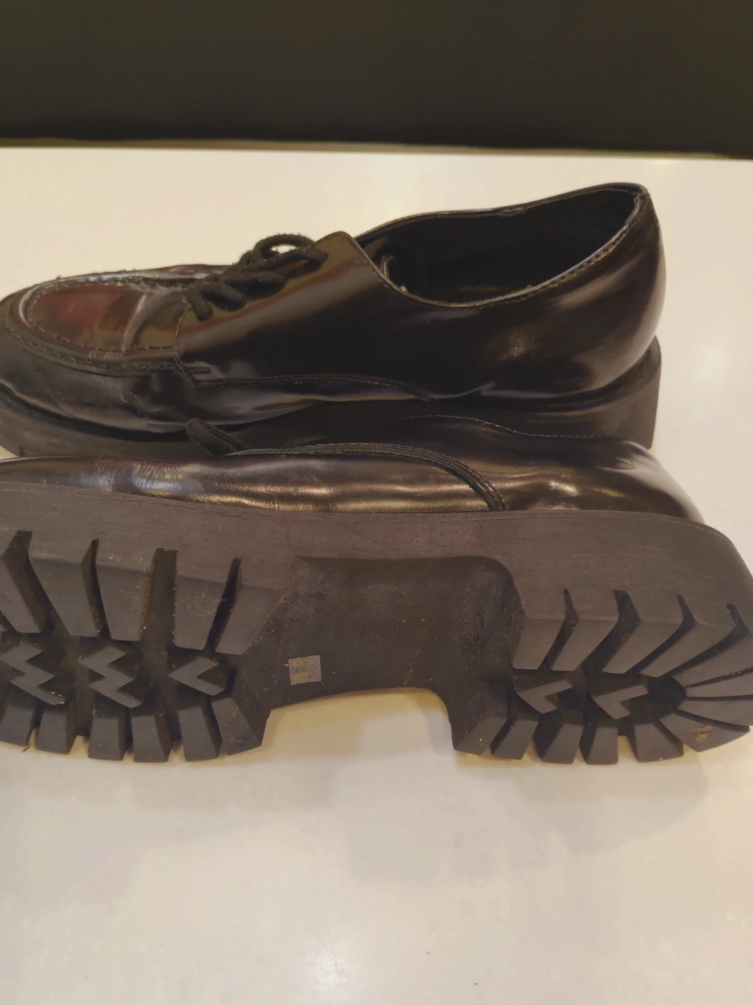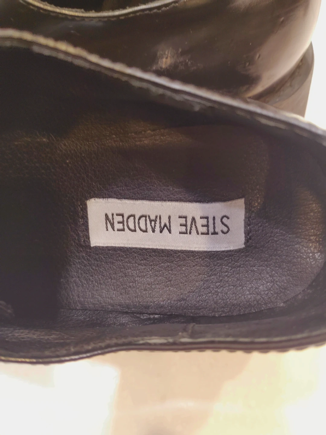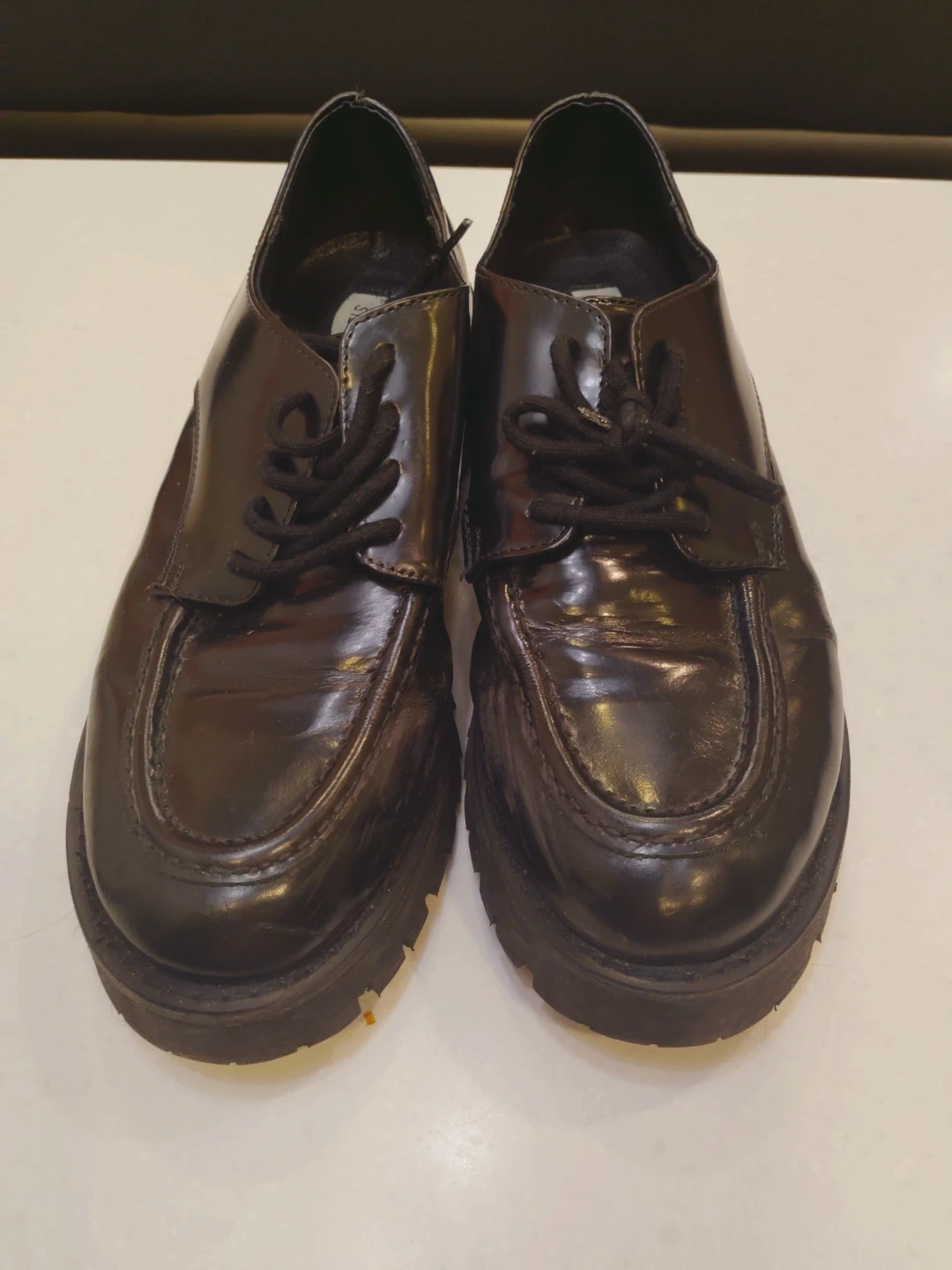 Black patent leather chunky loafers by Steve Madden. These have a classic lace-up front and a thick platform sole. Comfortable and stylish for everyday wear!