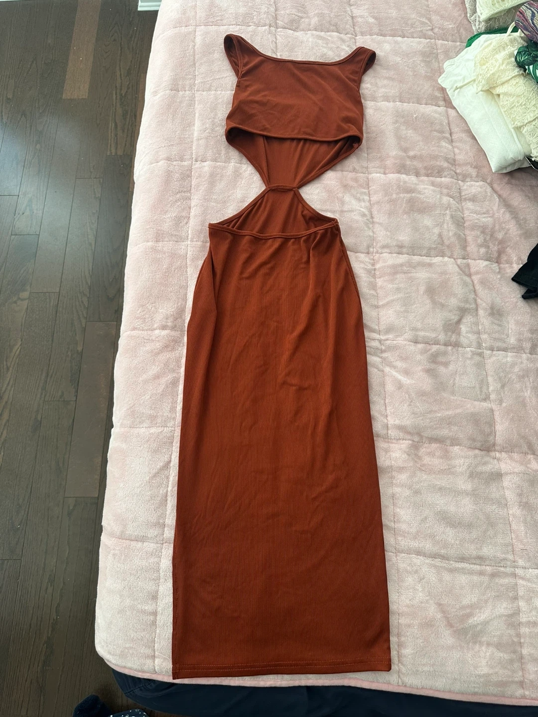A rust-coloured, ribbed maxi dress with a cutout detail. It's made from a stretchy material and features a fitted silhouette. Perfect for a night out or a special occasion size xs