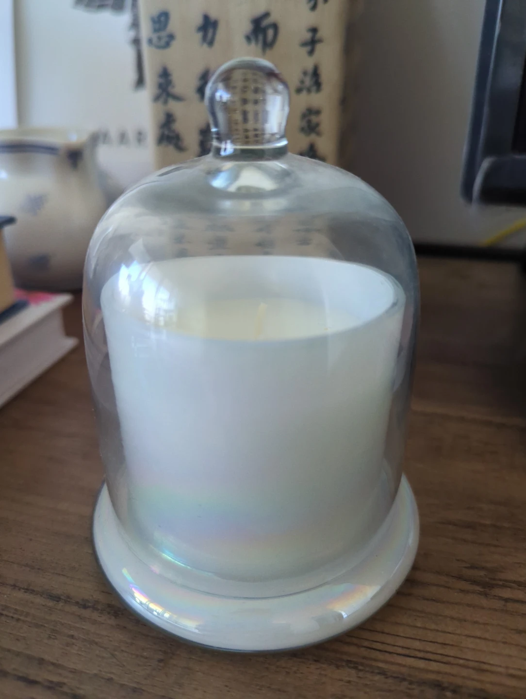 A white candle is housed under a clear glass dome with a decorative base. It's a lovely piece for any room. The base has an iridescent finish that catches the light.