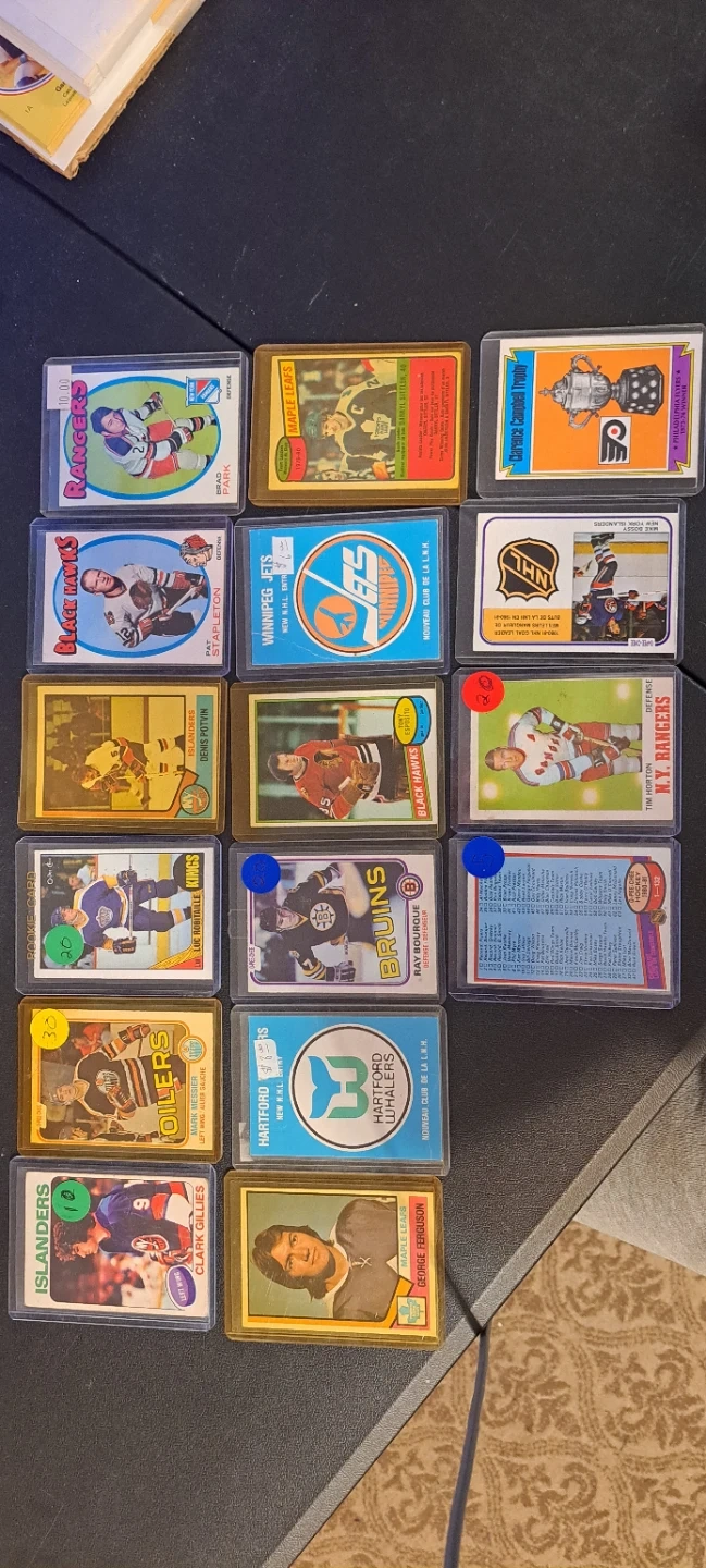 A collection of vintage hockey cards featuring various players and team logos. Many cards are in protective sleeves. Includes NHL stats and team affiliations.