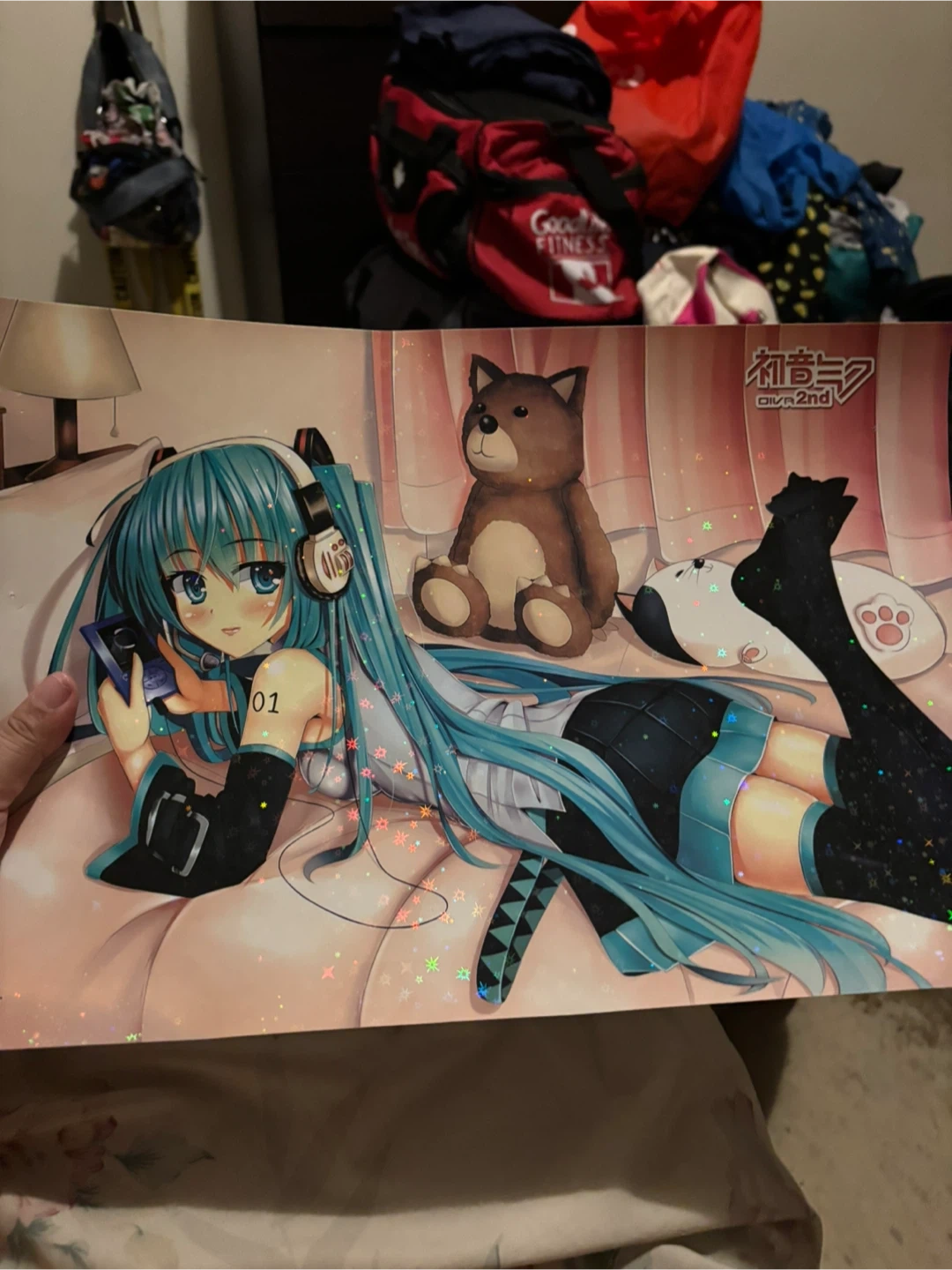 This is a holographic poster featuring Hatsune Miku from Project DIVA 2nd. It shows Miku lying down with headphones on, accompanied by a teddy bear and a cat plush. The poster has a glittery finish. It's great for fans of vocaloid and anime.