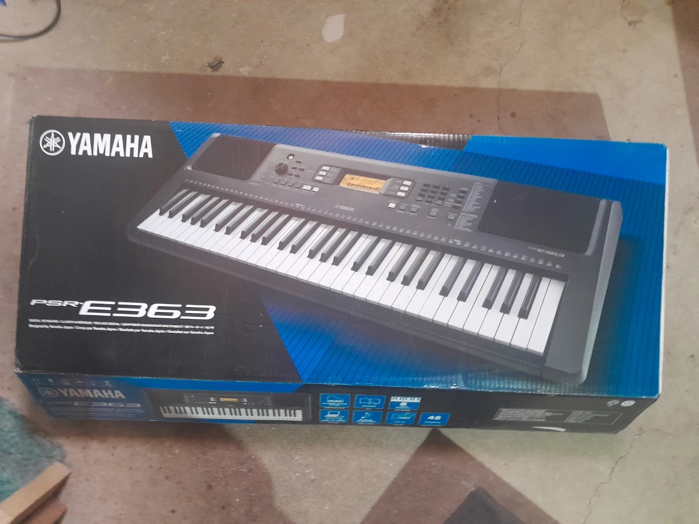Yamaha PSR-E363 portable electronic keyboard. Comes with a music stand and Alfred's Basic Adult Piano Course book. It's a great starter keyboard for learning to play!