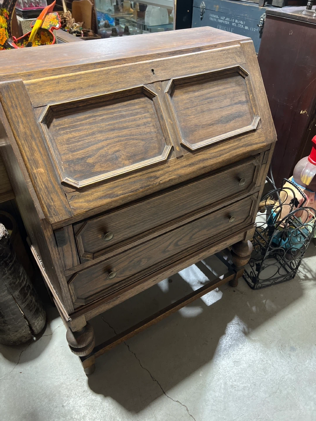 Vintage wooden secretary desk with a drop-down writing surface and built-in cubbies. It features three drawers for storage. This desk is made of solid wood. It's a classic piece for a home office or study.