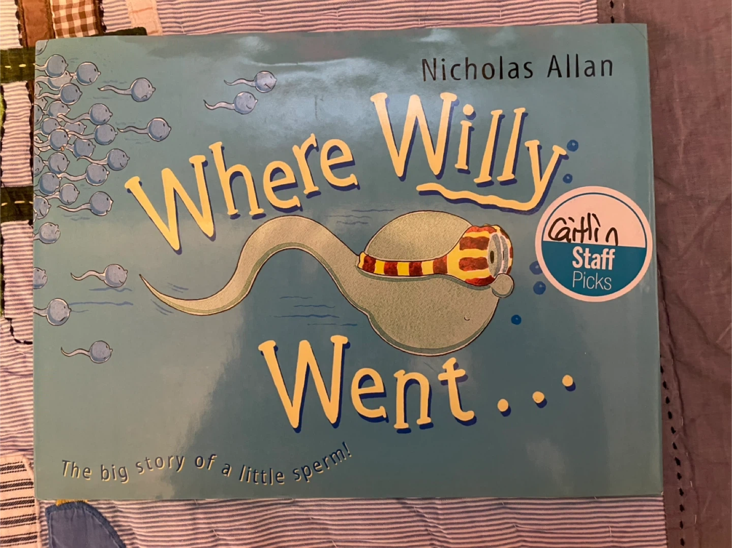 Selling the book "Where Willy Went..." by Nicholas Allan. It's described as 'The big story of a little sperm!'. This copy has a 'Caitlin Staff Picks' sticker on it. A fun and educational read!
