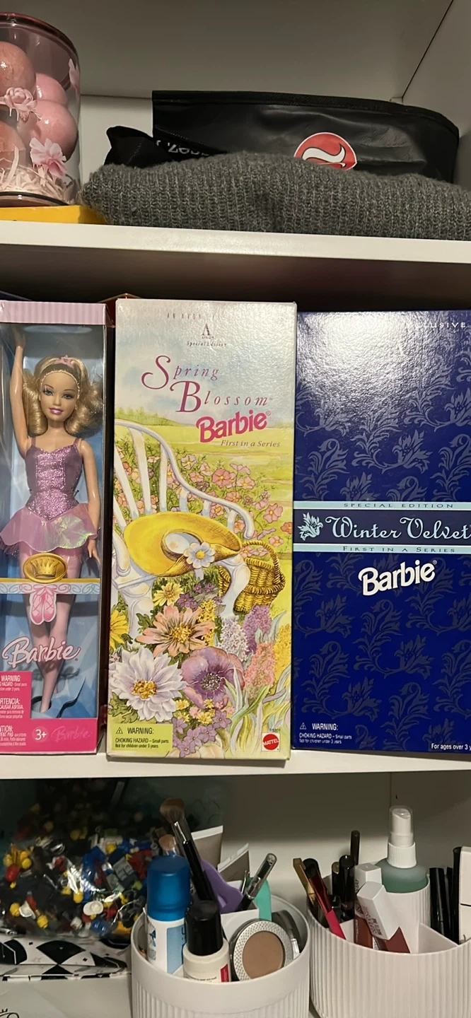 This listing includes three Barbie dolls: Spring Blossom Barbie, Winter Velvet Barbie, and Happy Holidays Barbie. These collector edition dolls are suitable for display or play. Starting at $25
