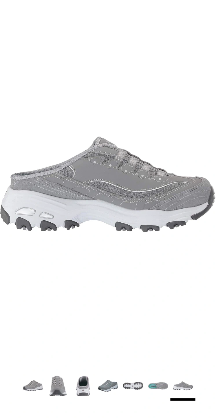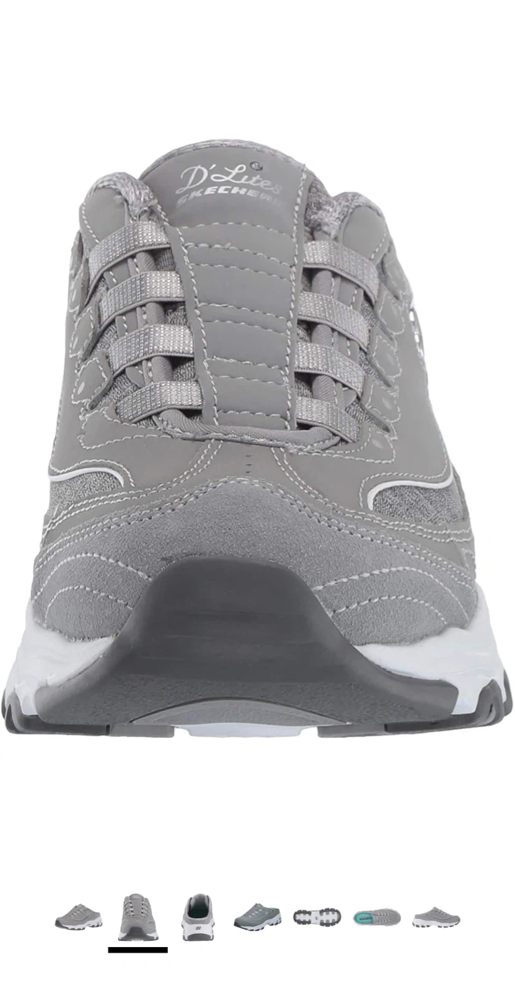 These are Skechers D'Lites women's slip-on sneakers. They feature Air-Cooled Memory Foam insoles for comfort. The shoes are grey with a white sole.