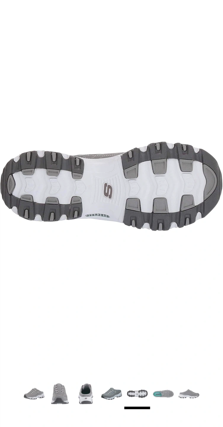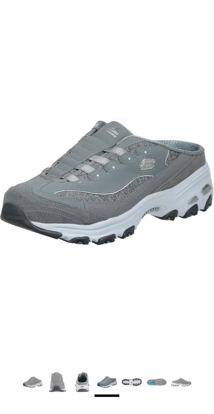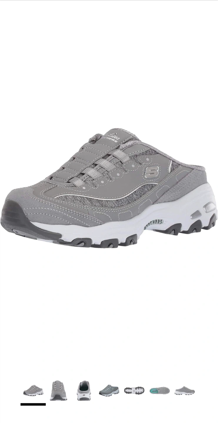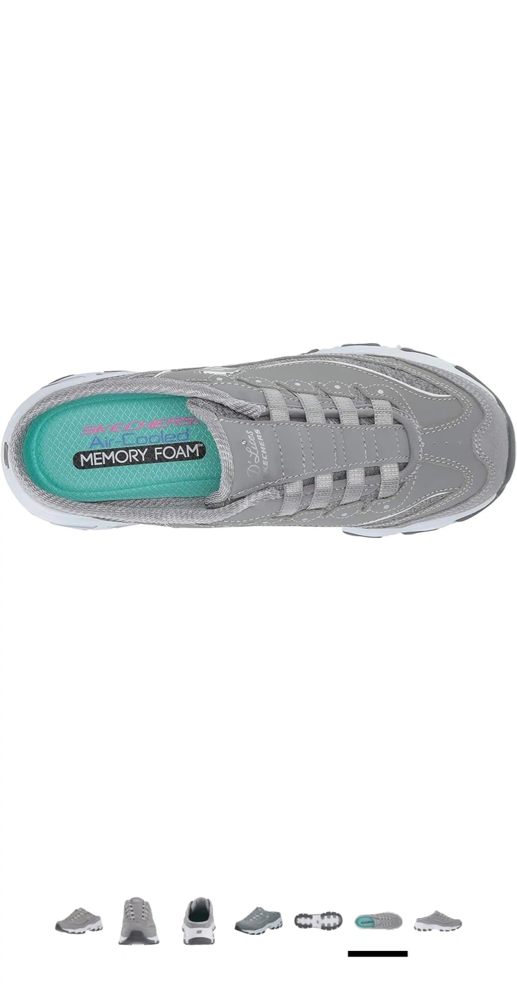 These are Skechers D'Lites women's slip-on sneakers. They feature Air-Cooled Memory Foam insoles for comfort. The shoes are grey with a white sole.